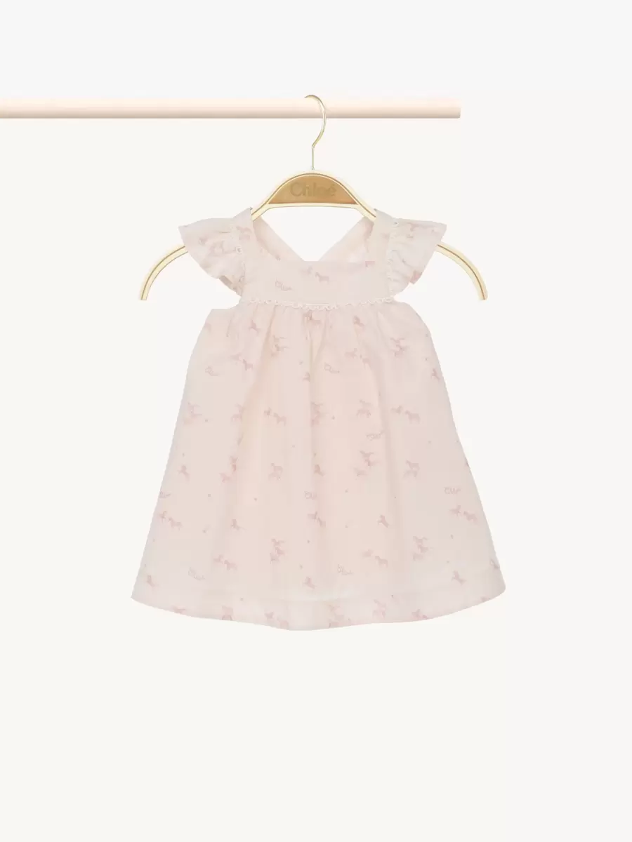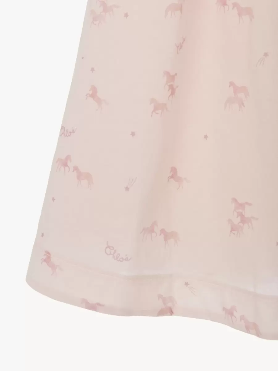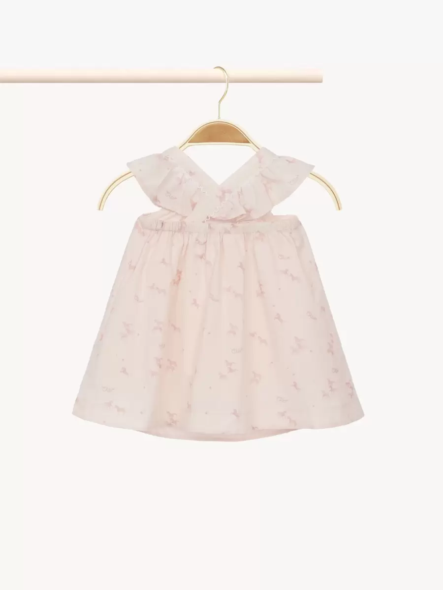 Denna utsvängda ärmlösa klänning är gjord av ekologisk bomullspoplin och har ett heltäckande ”Little Horses”-motiv accentuerat med Chloé-logotypen. Volanger och vågiga kanter detaljerar axlarna och den övergripande ryggen.