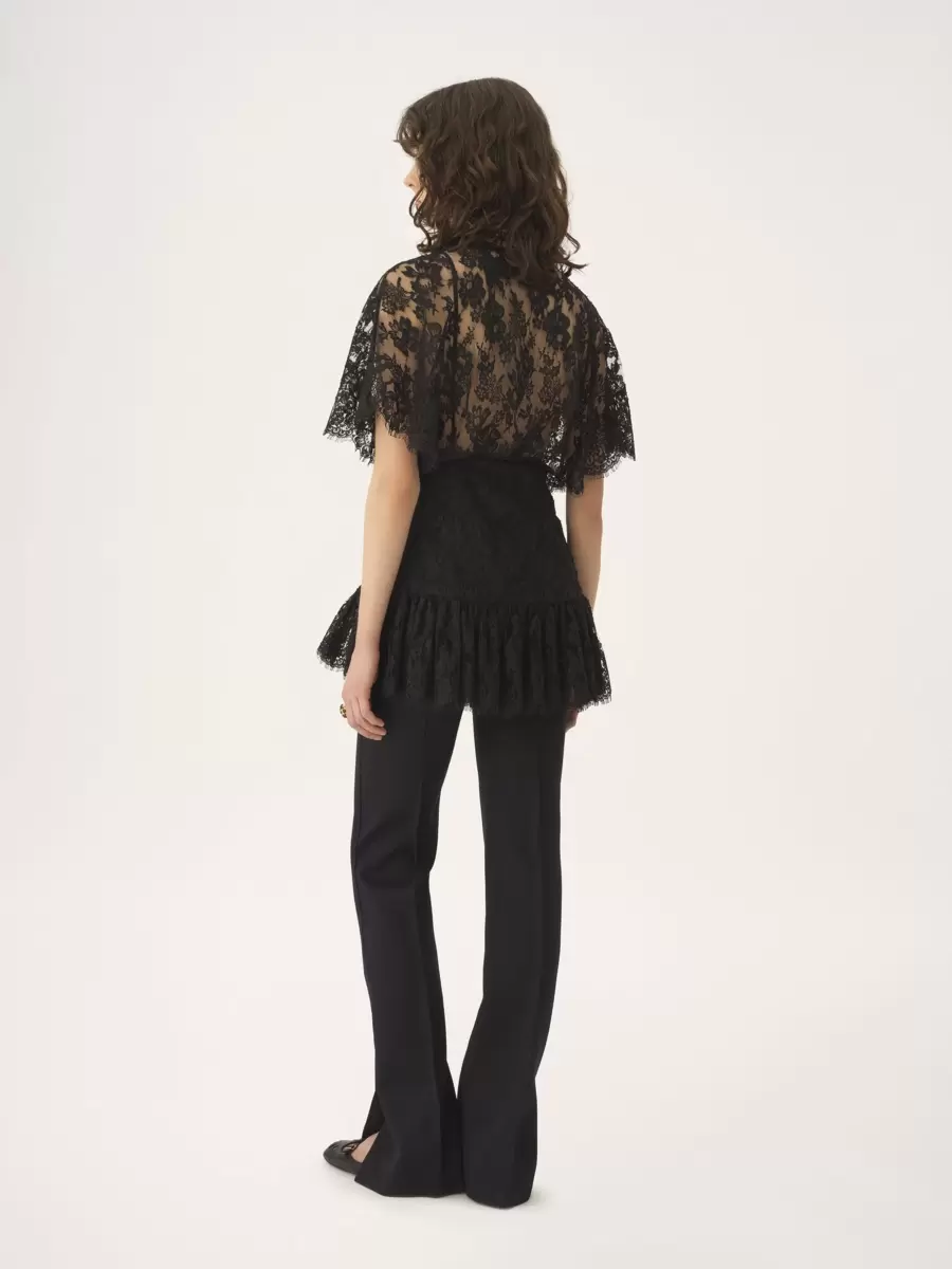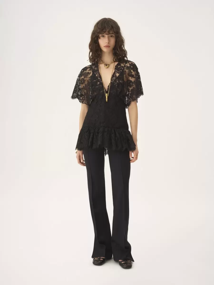 V-ringad, åtsittande topp i blommig spets med foder i sidenblandning och volangkant.