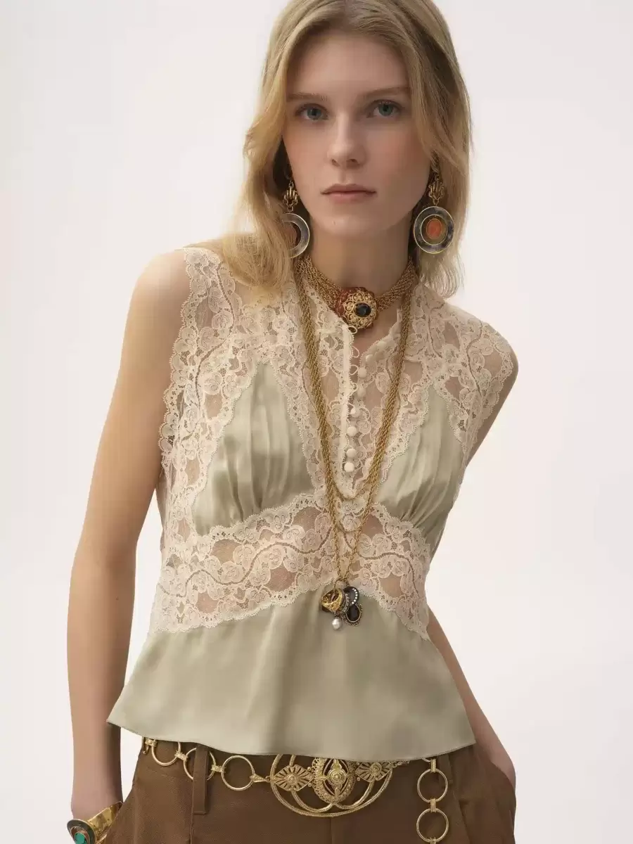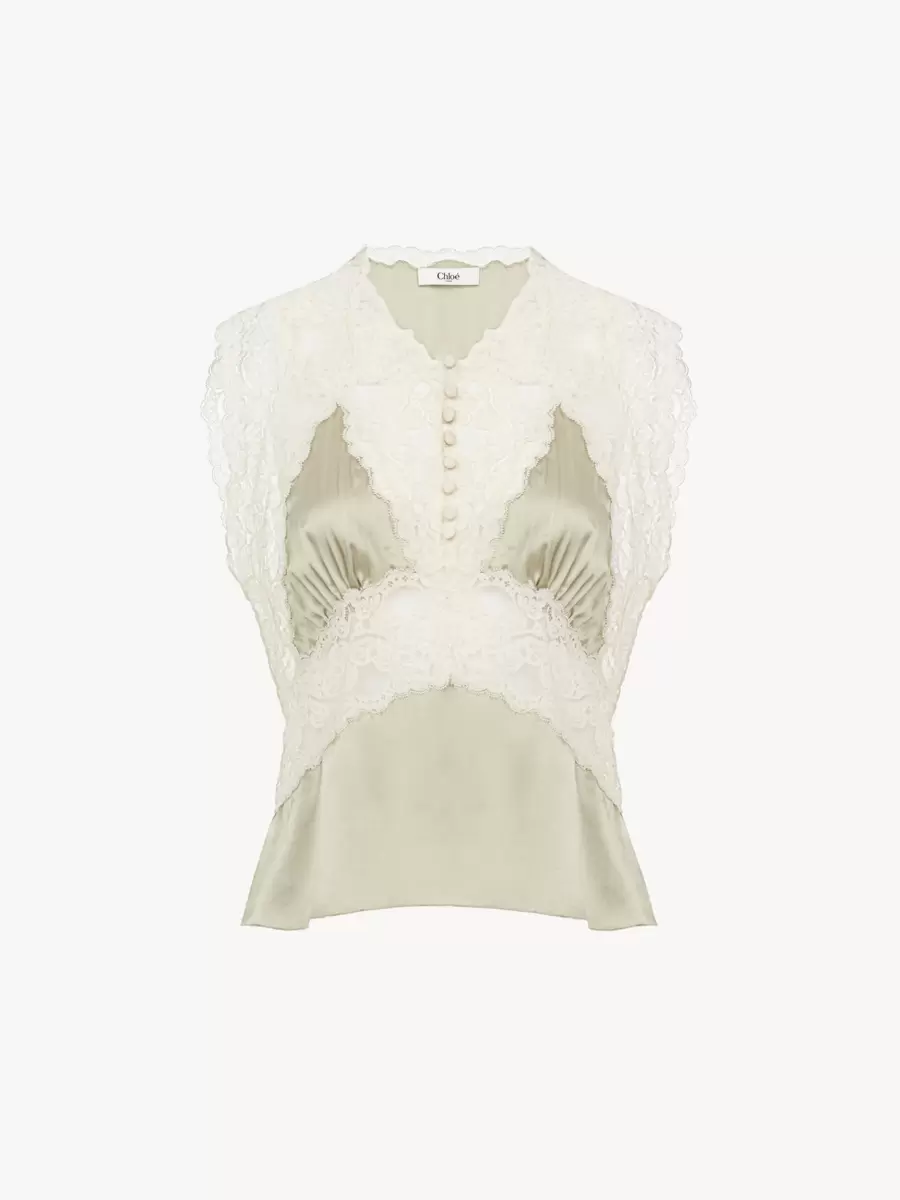 V-ringad topp i sidensatin med kontrasterande spetsinsatser och tygklädda knappar.