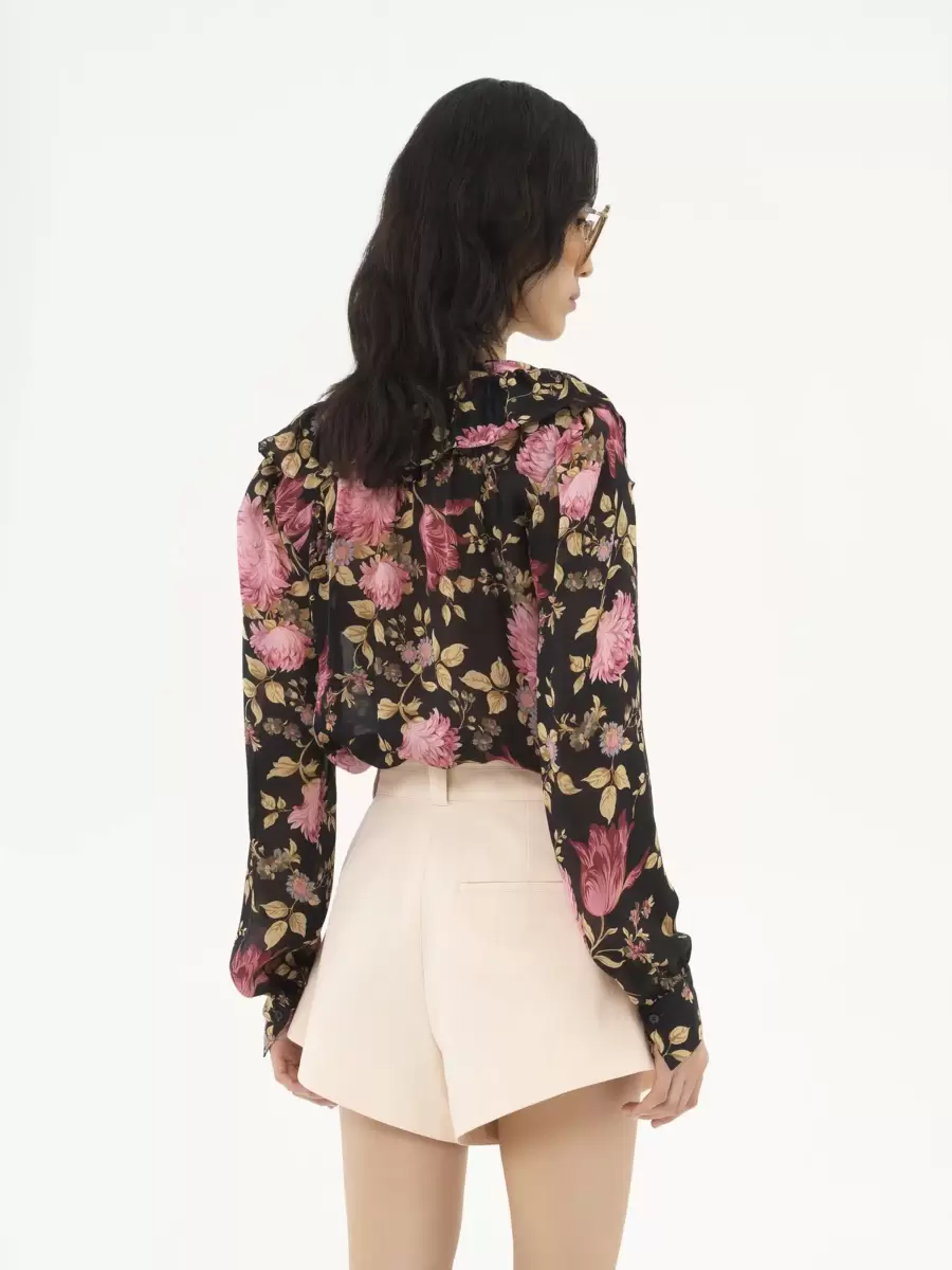 V-ringad, volangprydd blus i charmeuse av ekologisk siden med ett piontryck med rötter i Maisons arv. Rynkade detaljer och volanger fulländar detta plagg.