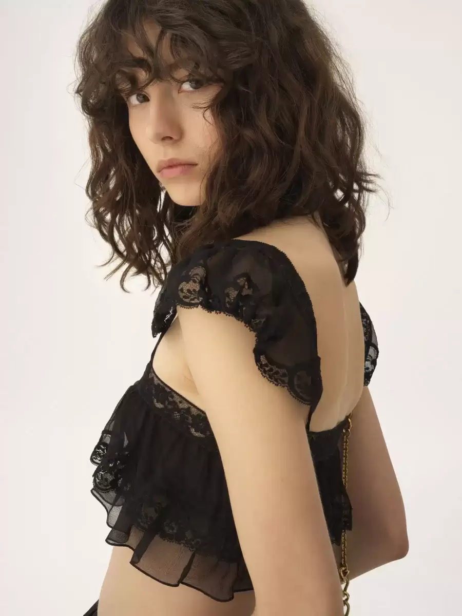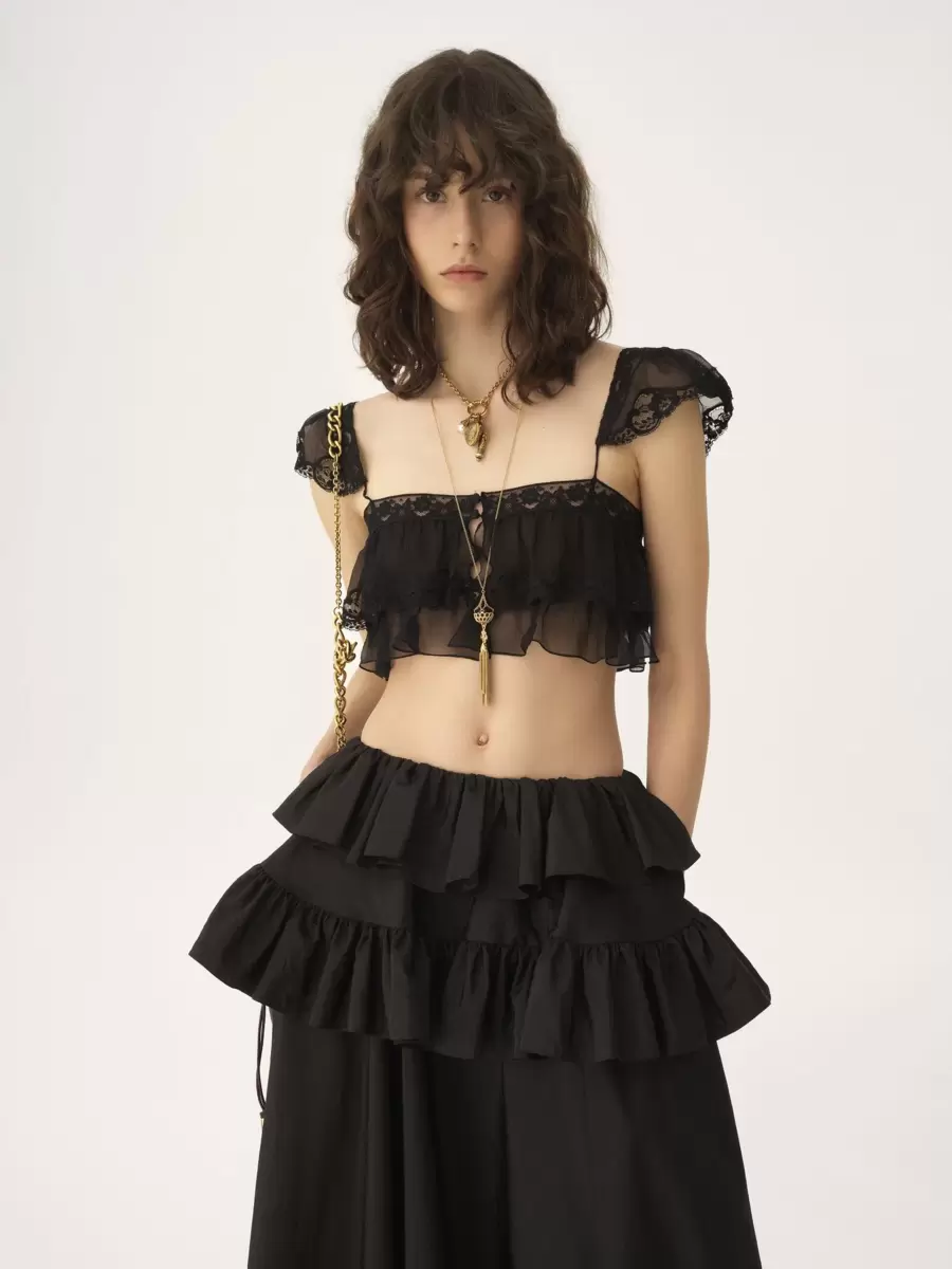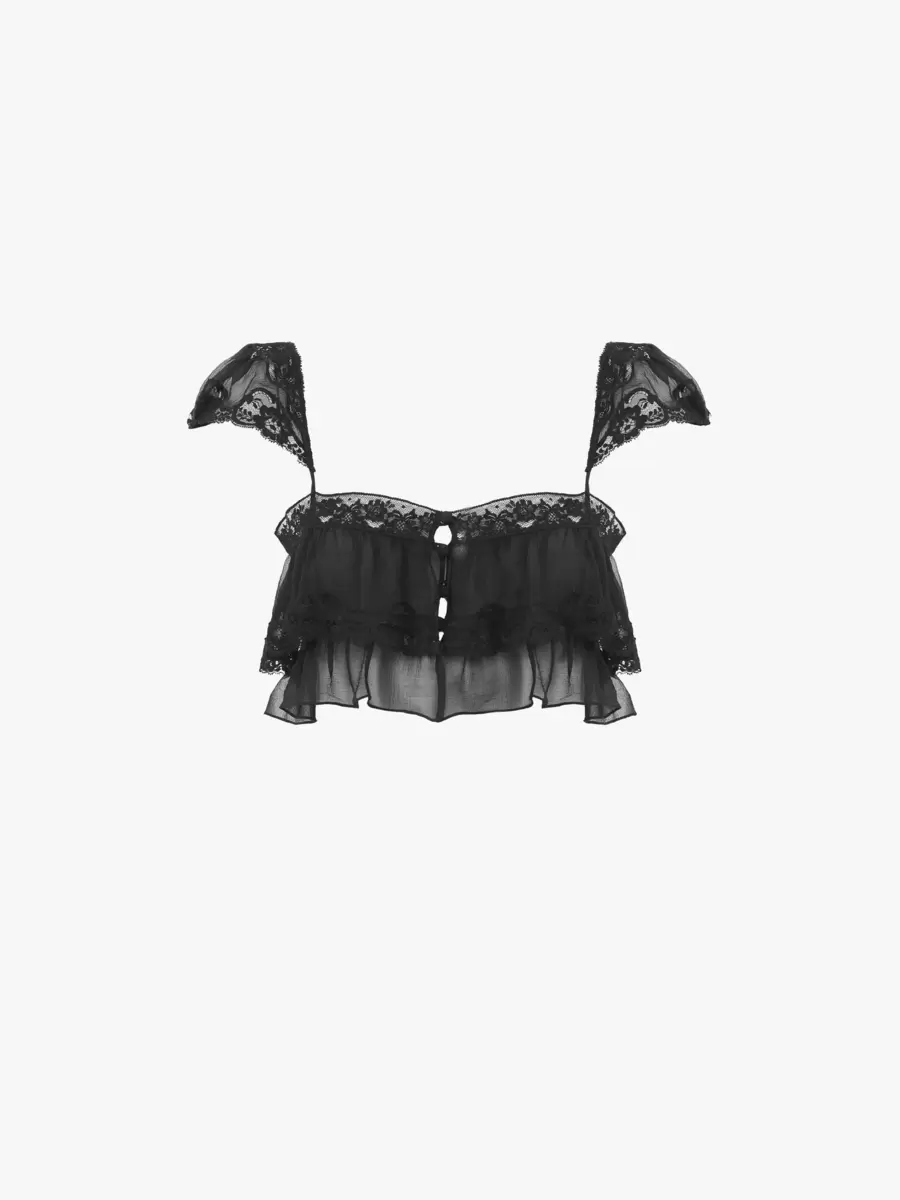 Flydande volangbralette i ekologisk sidenmousseline, med spetskanter, holkärmar och tygklädda knappar.