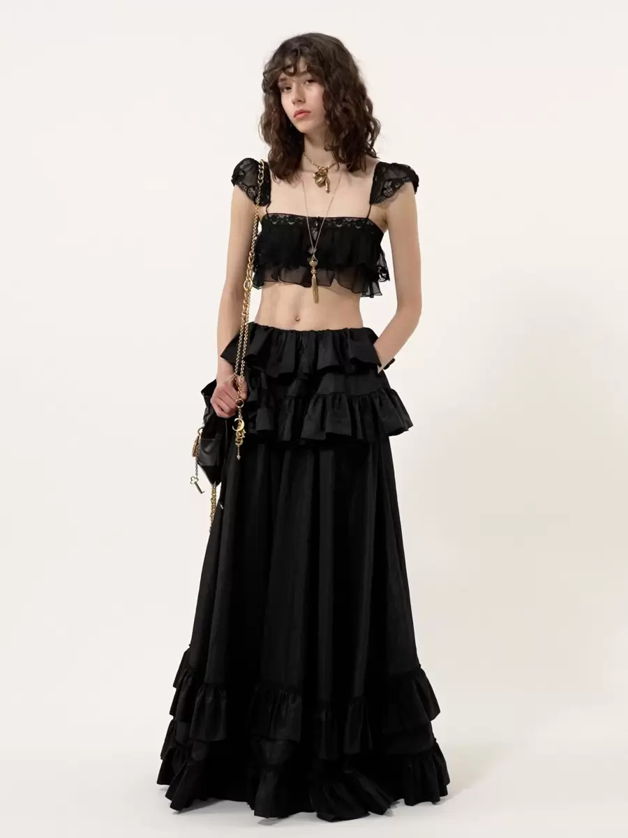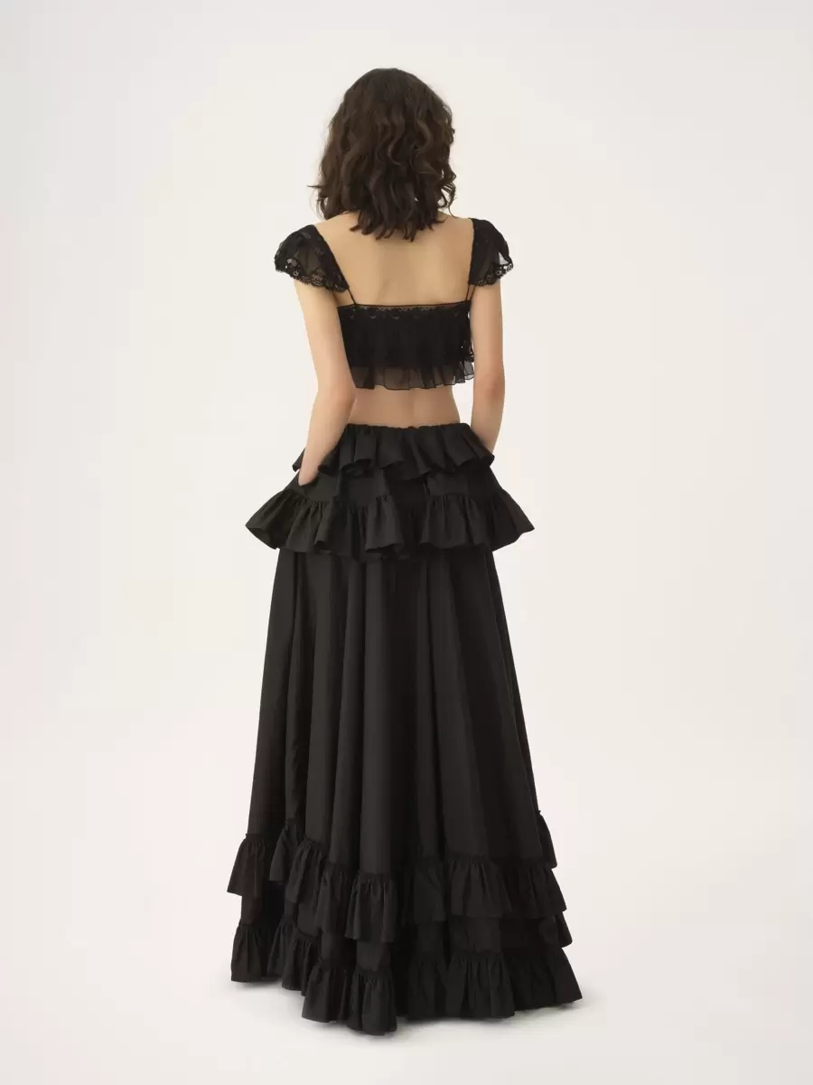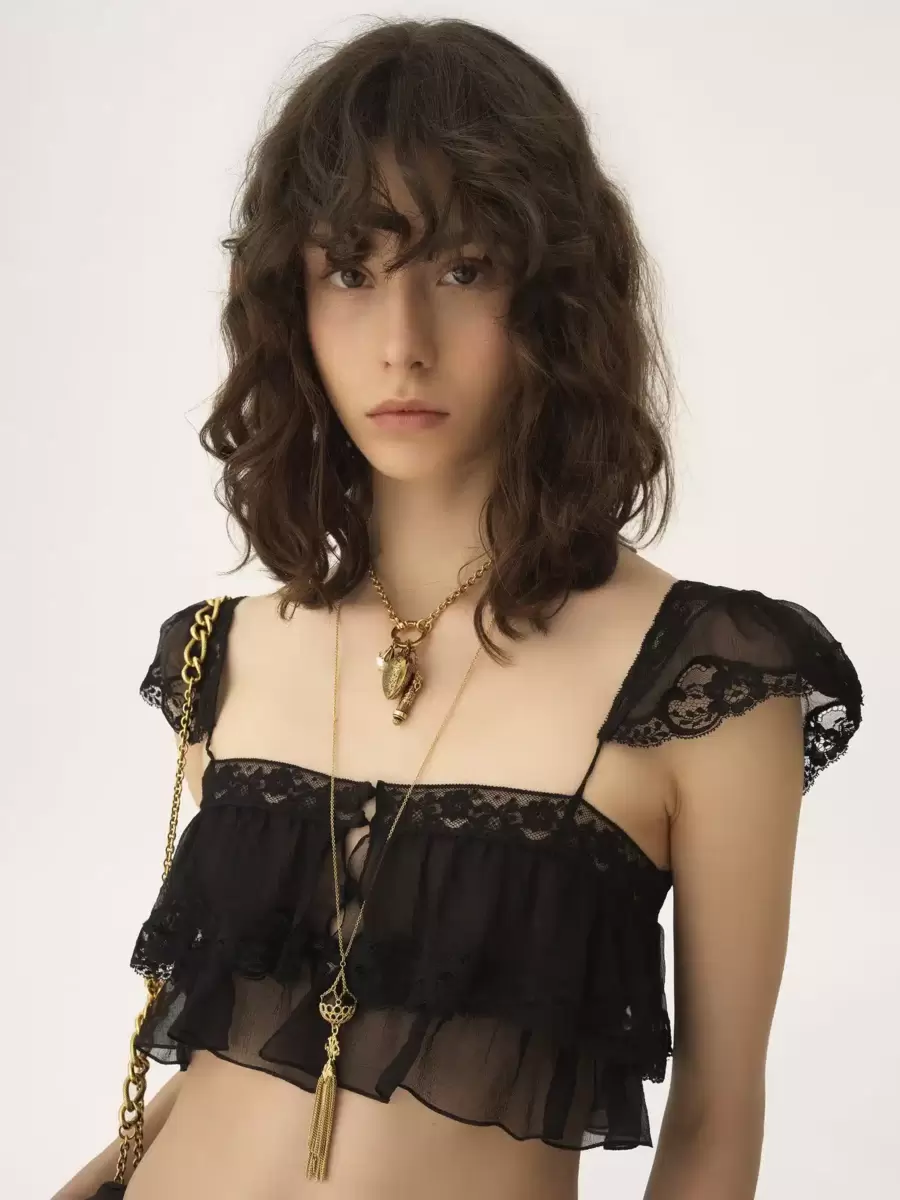 Flydande volangbralette i ekologisk sidenmousseline, med spetskanter, holkärmar och tygklädda knappar.