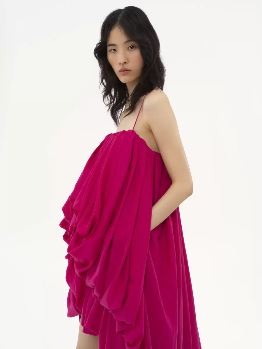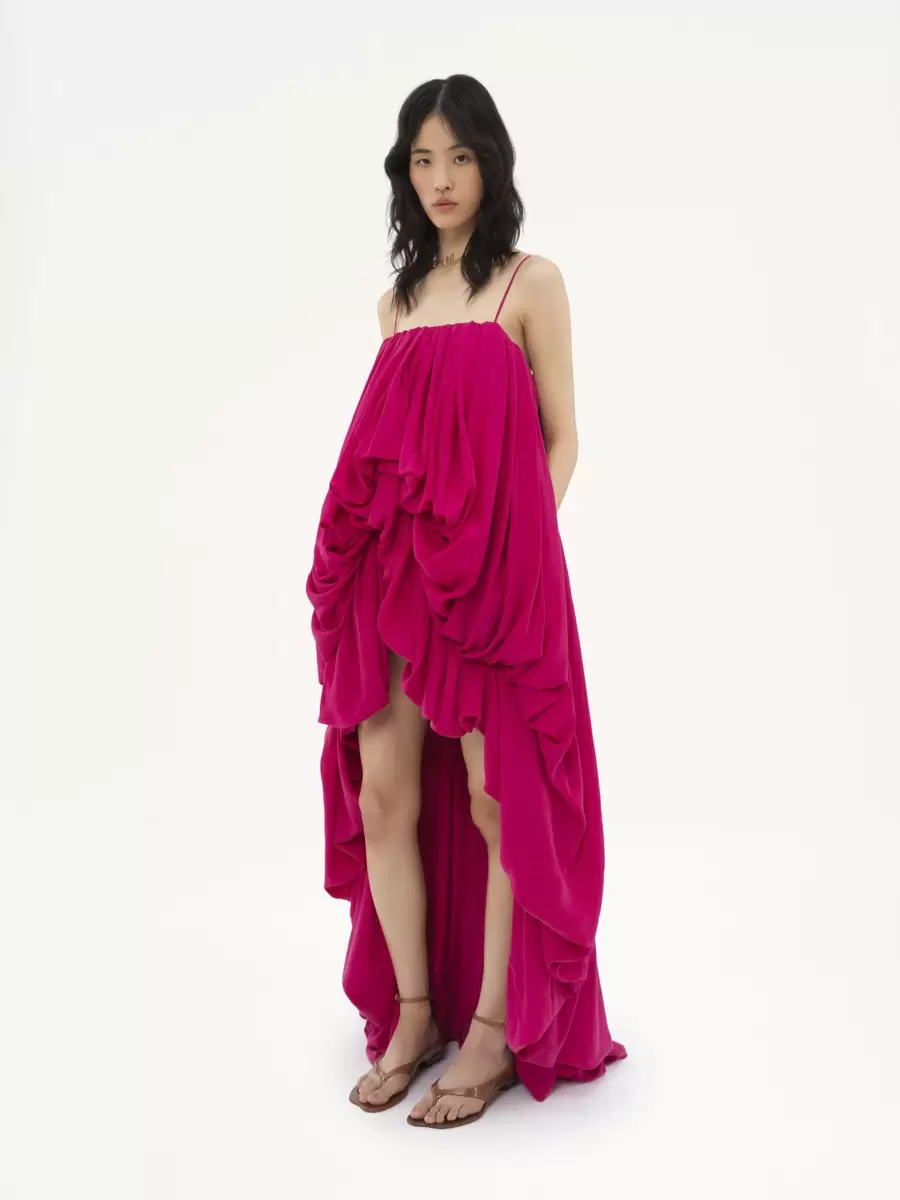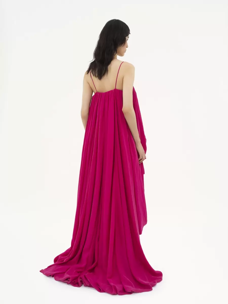 High-low ärmlös jumpsuit i tvättad sidenpongé, som kombinerar tunna axelband med en rynkad, böljande silhuett.