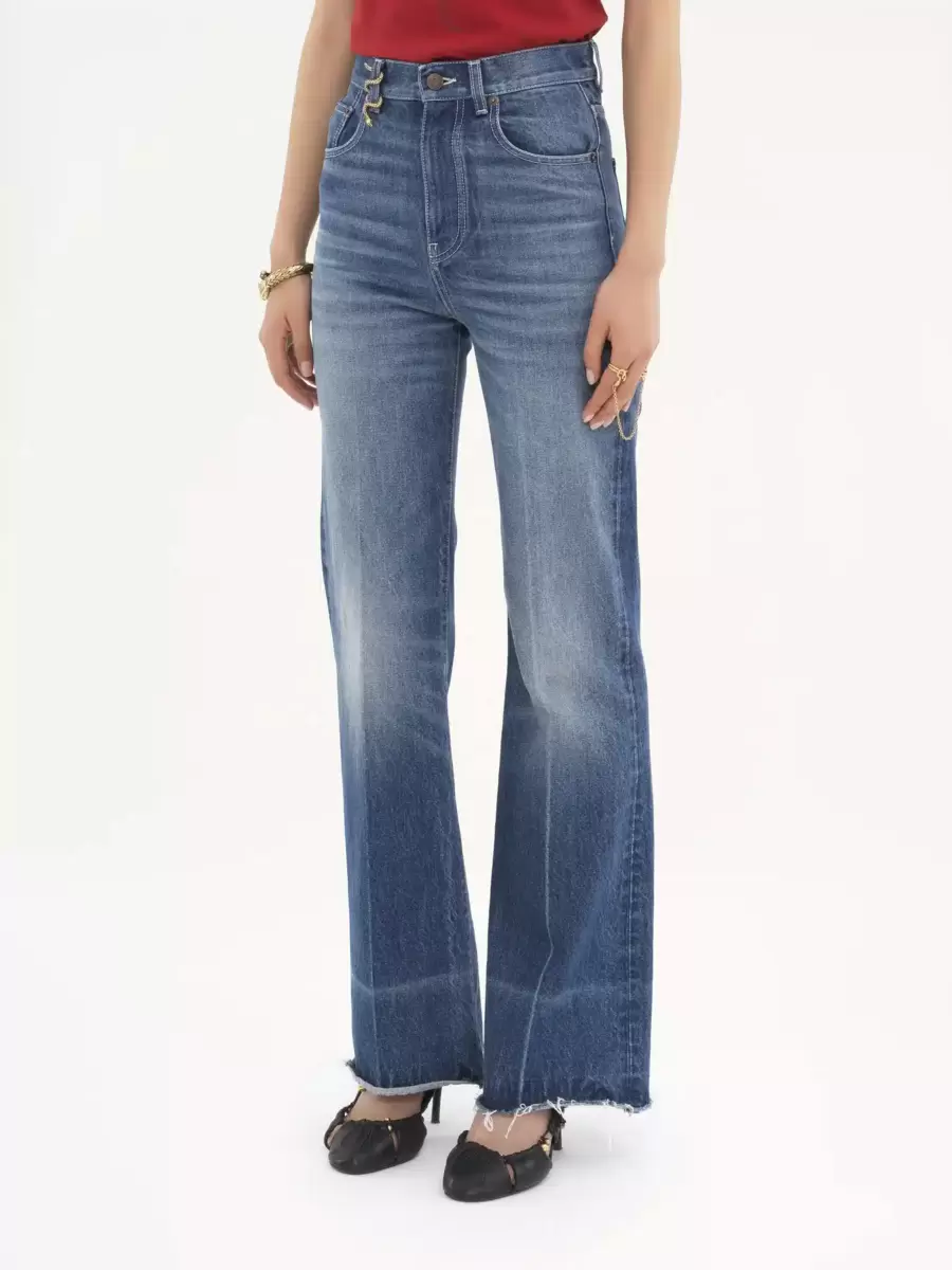 Högmidjade bootcut-jeans i vattenfri denim med rå fåll, med en guldtonad ormliknande utsmyckning i metall runt en av bälteshällorna.