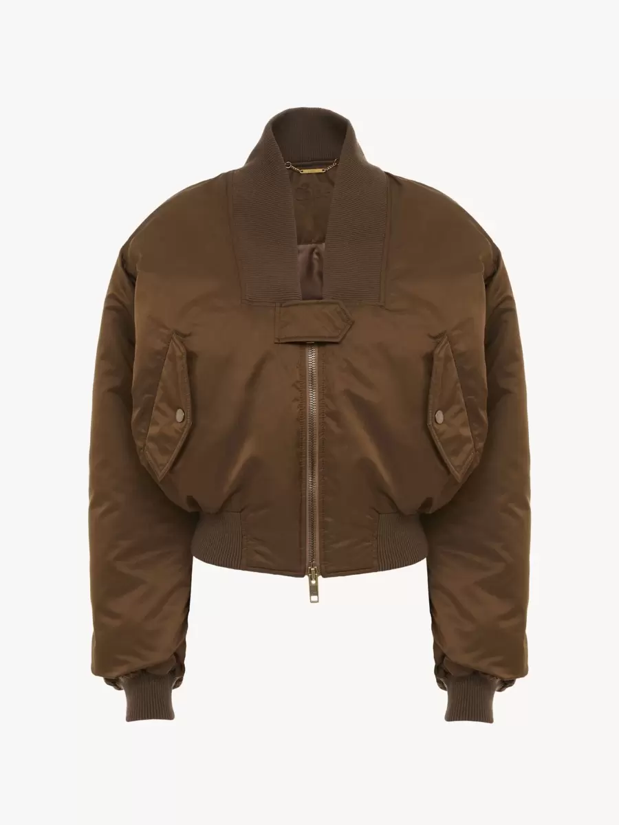 Bomberjacka i nylon med kontrasterande ribbade kanter vid maxikragen, midjan och ärmsluten. Fickor med tryckknappar och en ärmficka med dragkedja avslutar detta plagg.
