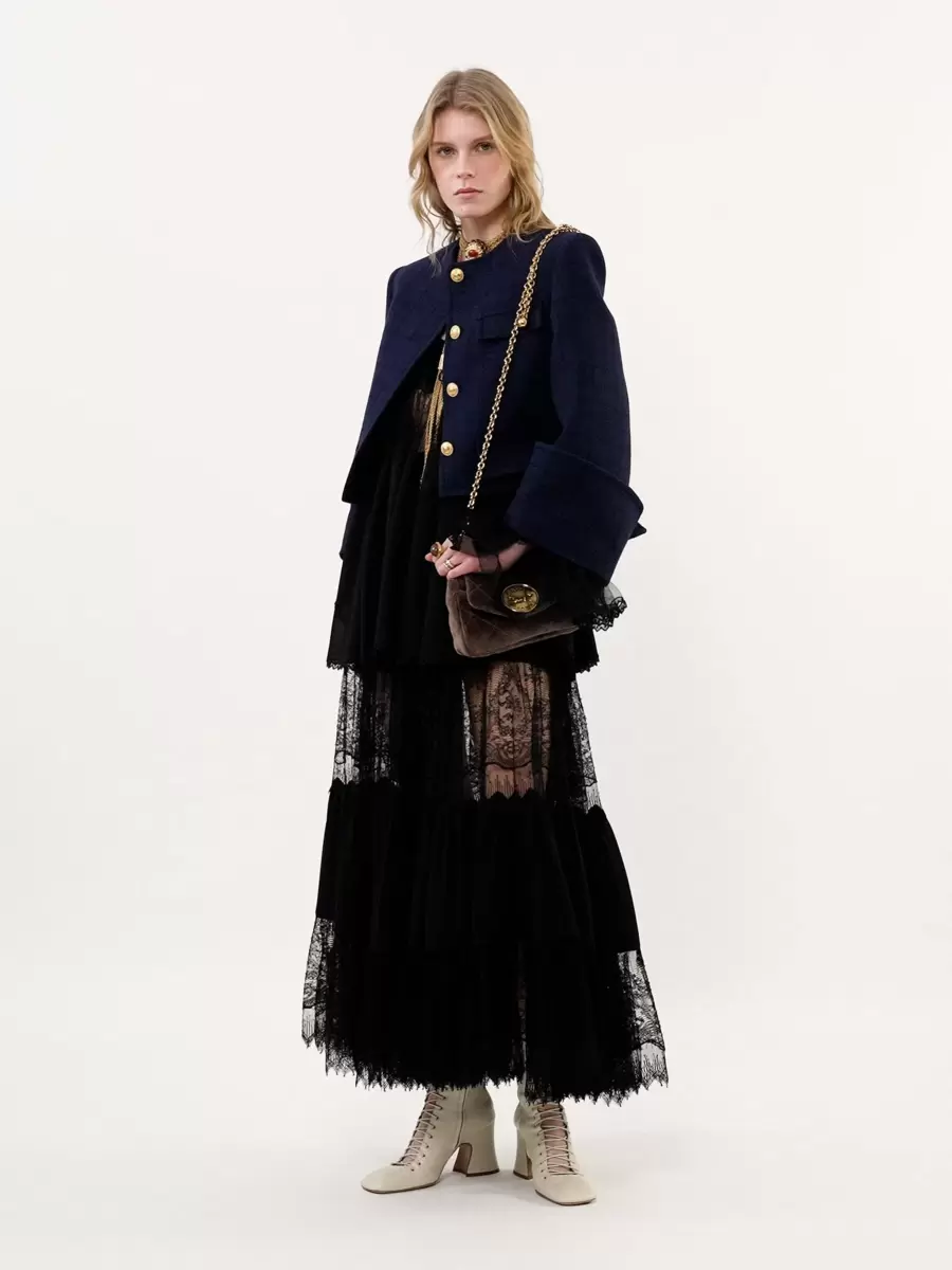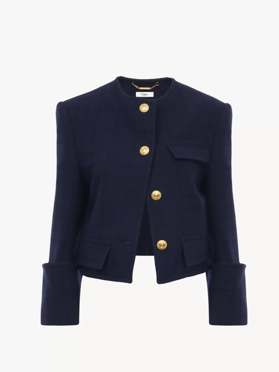 Kaddig kraglös jacka i ullrutig kvalitet med guldfärgade knappar, fickor med lock och uppvikbara maskor.