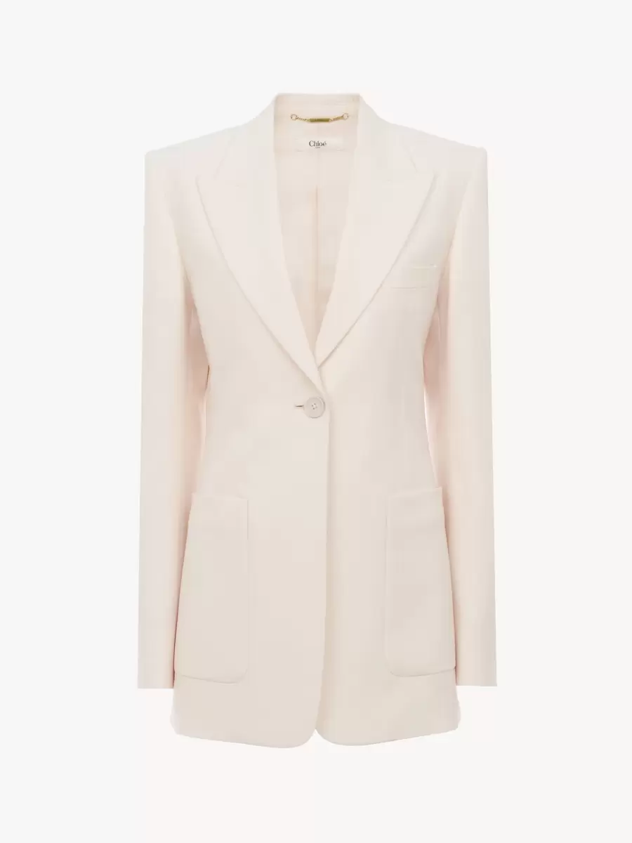 Enkelknäppt skräddarsydd jacka i lätt ullgabardin med låg stötdämpning, med överdimensionerade framfickor och graverade hornknappar i olika toner.