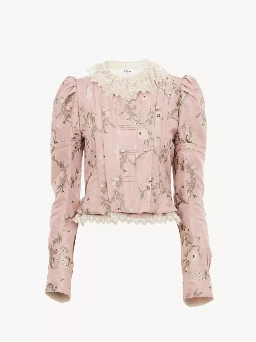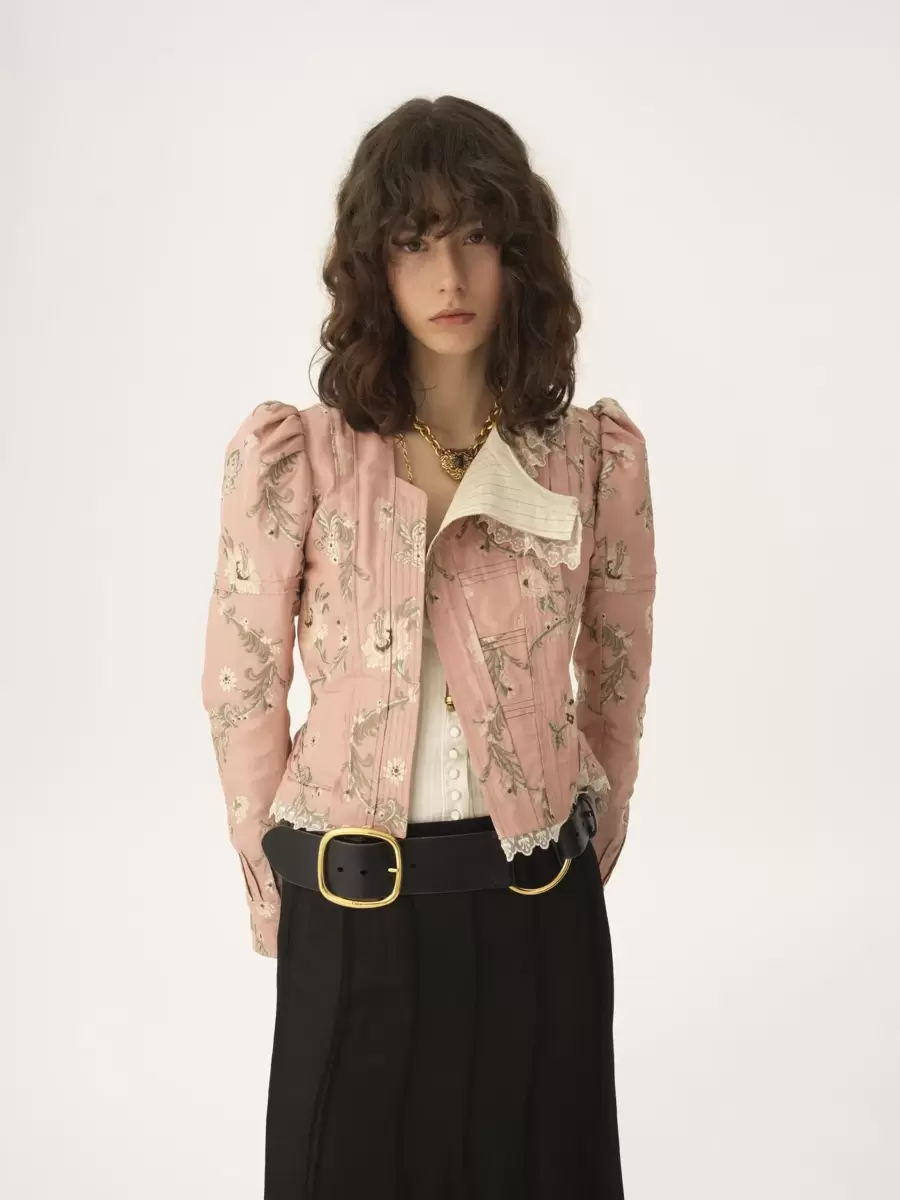 Broderad barock, åtsittande jacka i blommig jacquard-taft av sidenblandning, med spetsdekorationer, puffiga axlar och hysk- och hakknäppning.