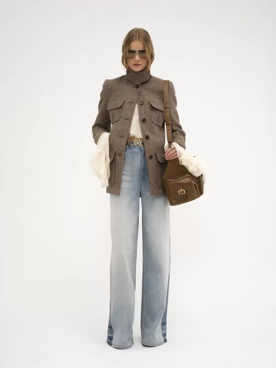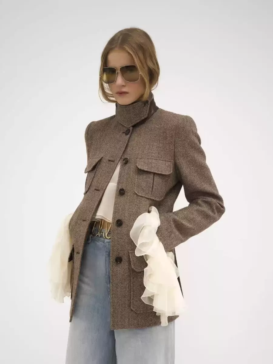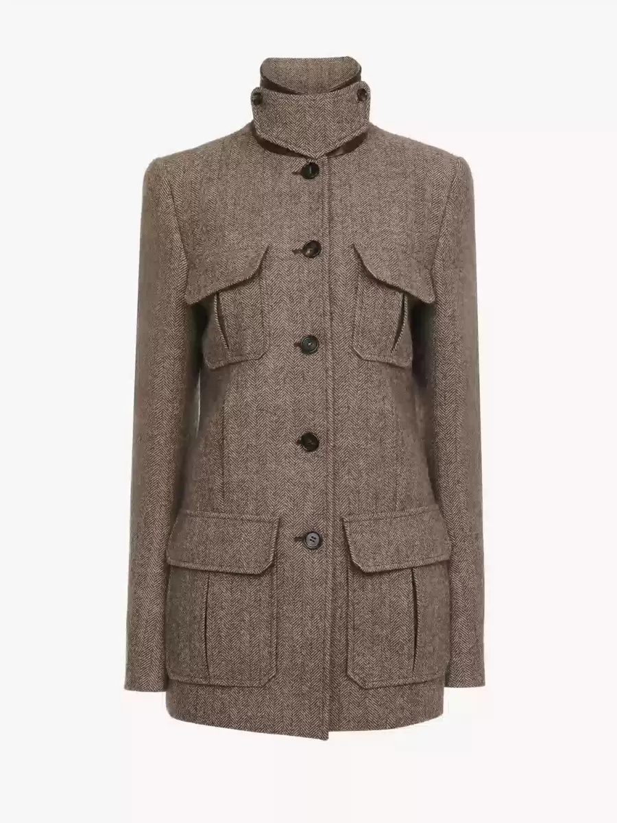 Lång officersjacka i pojkaktig, lättslitande fiskbensull, med hakrem, läderdetaljer, hornknappar och fickor med lock.