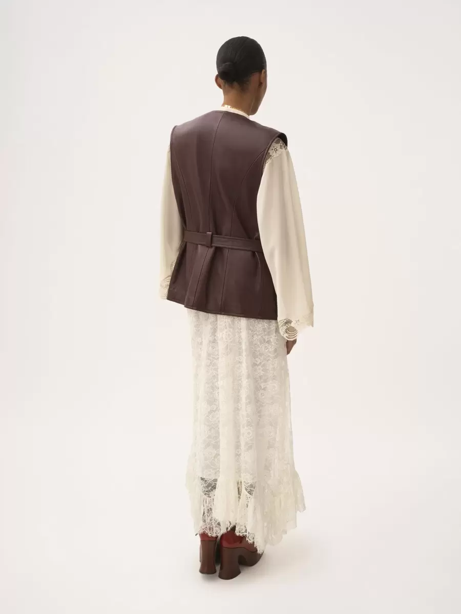 Utilitetsväst med skärp i mjukt lammskinn, V-ringning, bälgfickor och guldfärgade militärknappar.