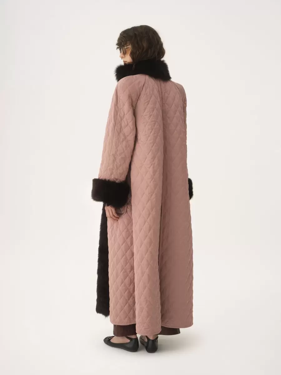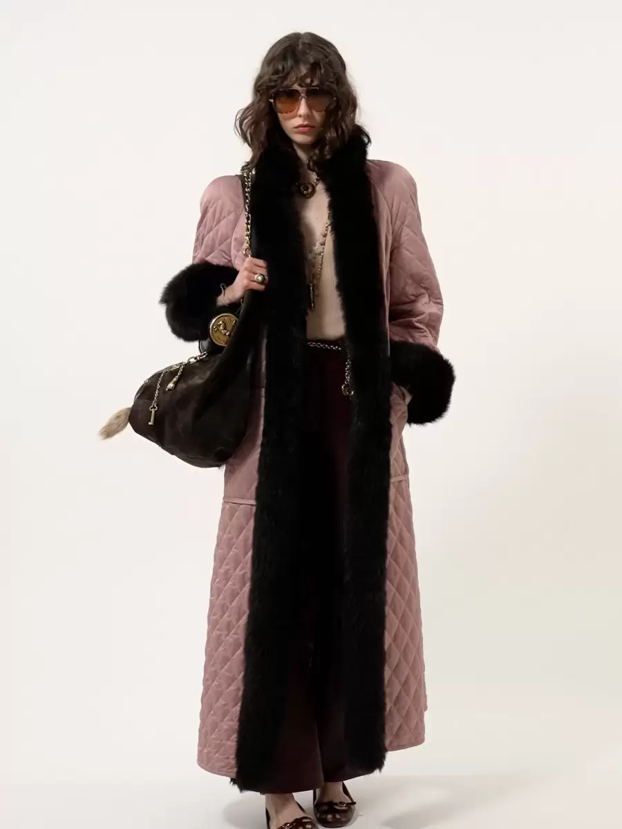 Lång höghalsad kappa i quiltad teknisk satin med kontrasterande fårskinnskanter, avslutad med maxi-fickor.