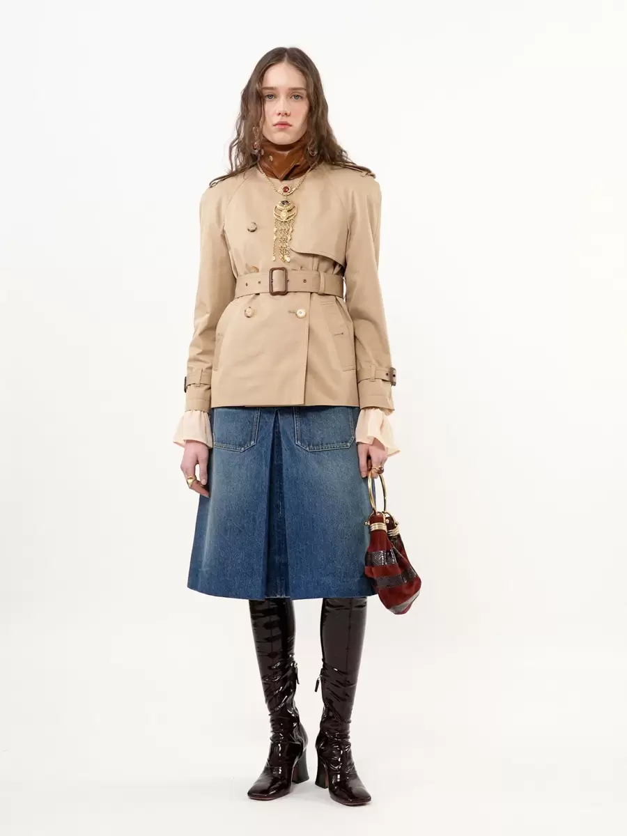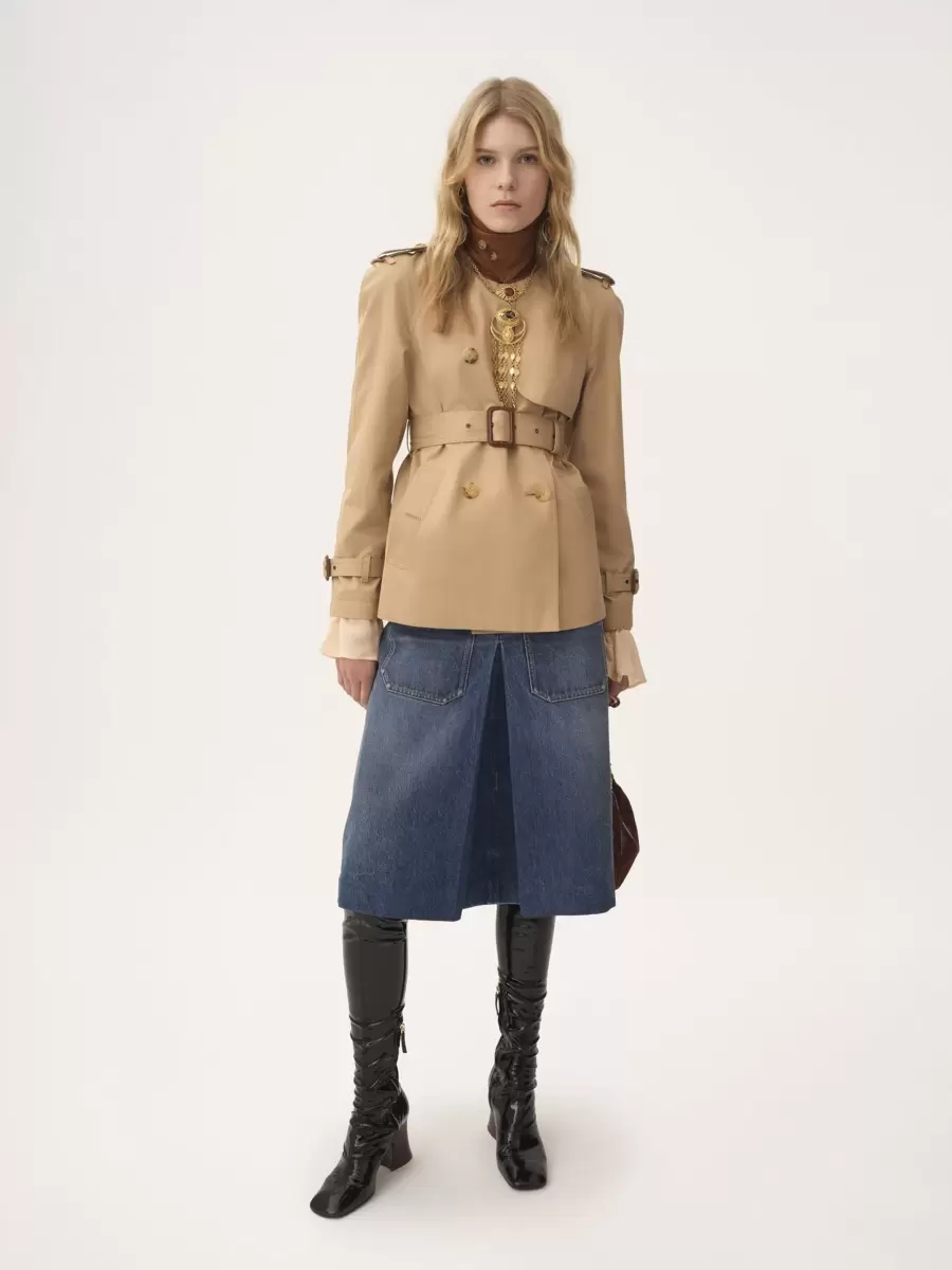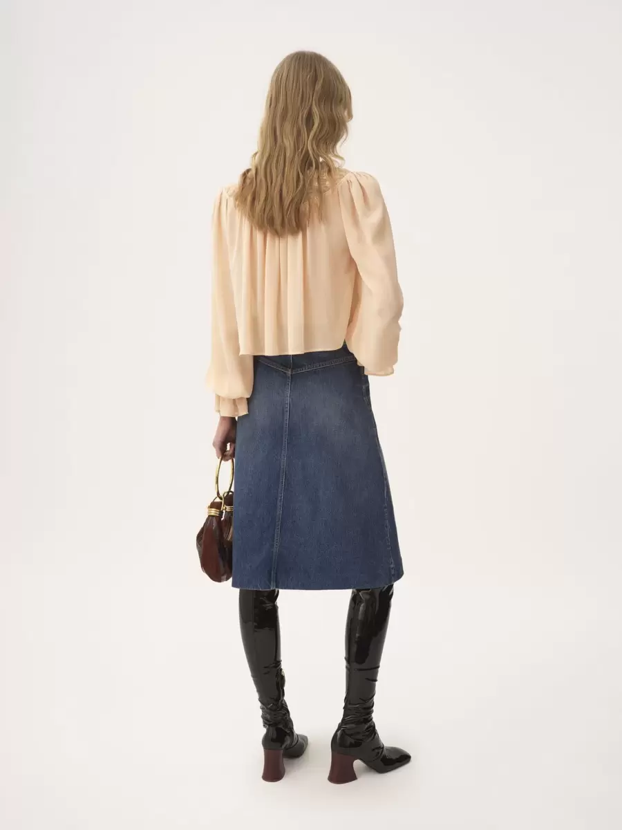 Knälång kjol i trasig blå ekologisk bomullsdenim med Chloé-graverade knappar, överdimensionerade påsydda fickor med diagonala dragkedjor och ett veck fram.