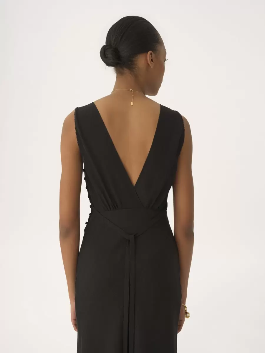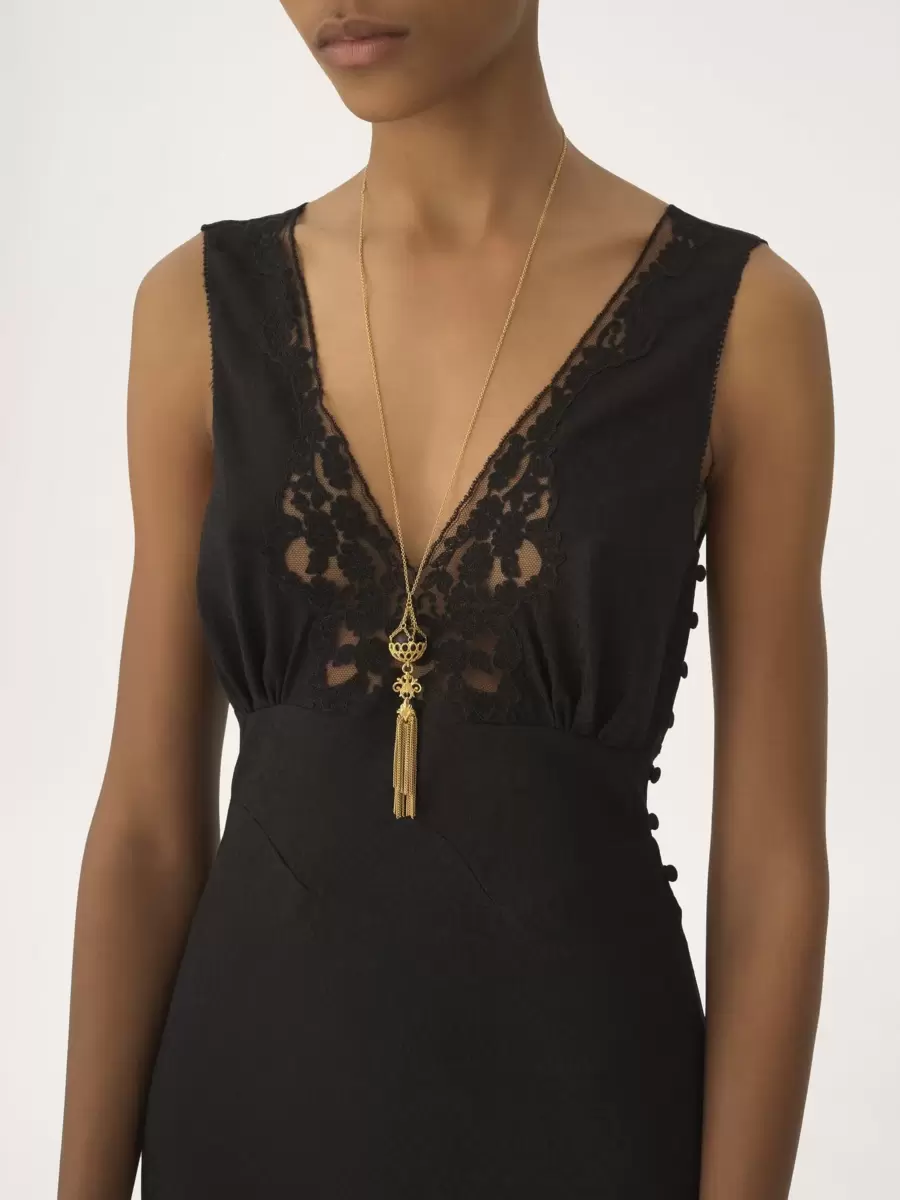 V-ringad ärmlös kolumnklänning i mini blommig jacquard av ekologiskt siden med spetsinsatser, tygklädda knappar och bandknytning.