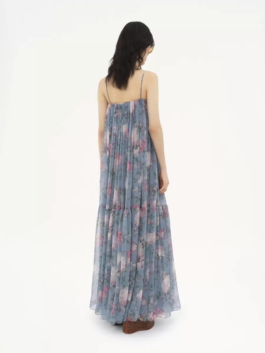 Ärmlös långklänning i ekologisk sidenmousseline med foder i sidenblandning, med ett heltäckande piontryck inspirerat av Maisons arv. Tunna axelband avslutar den flytande, skiktade silhuetten.