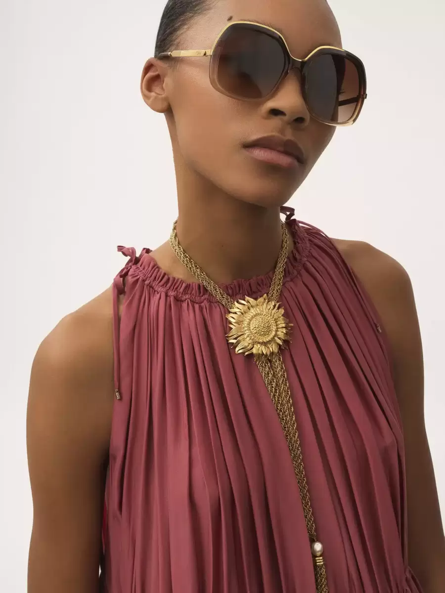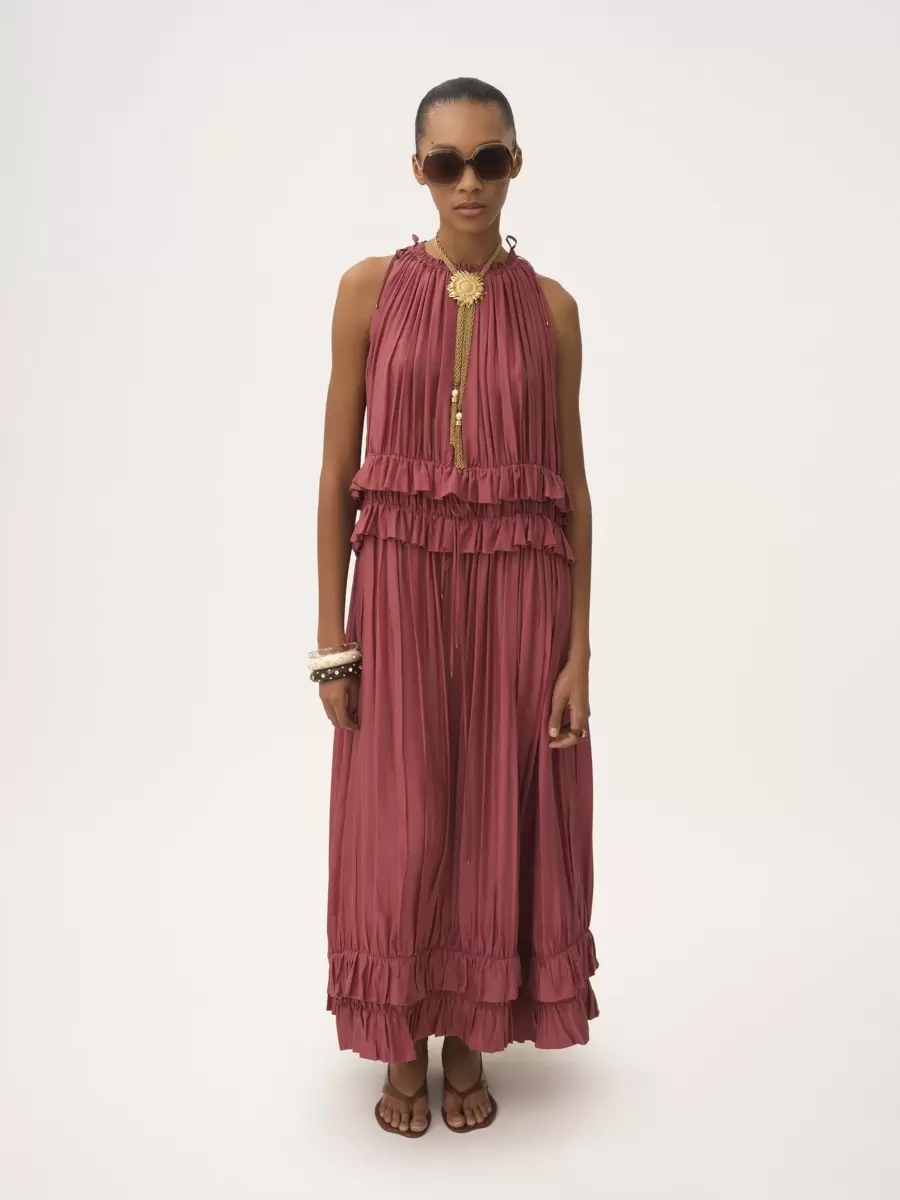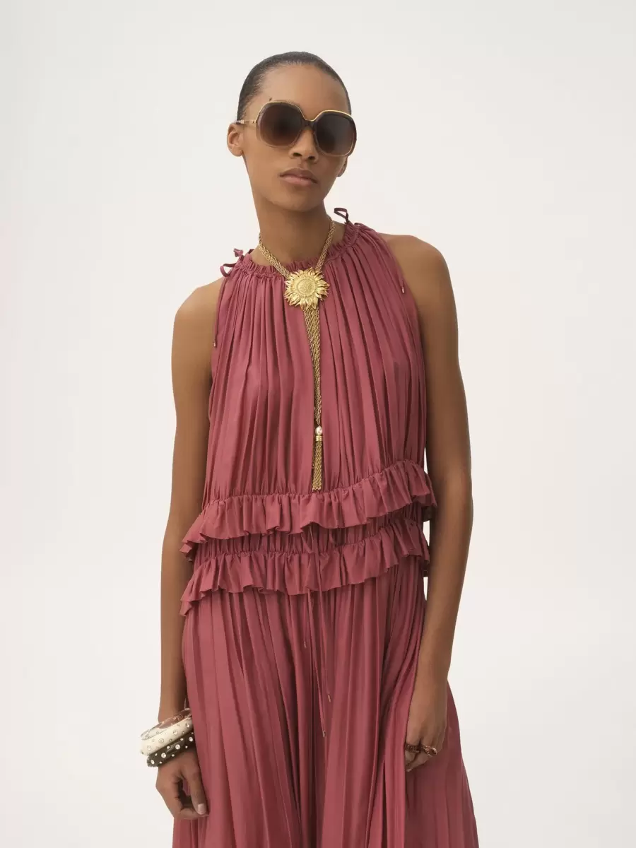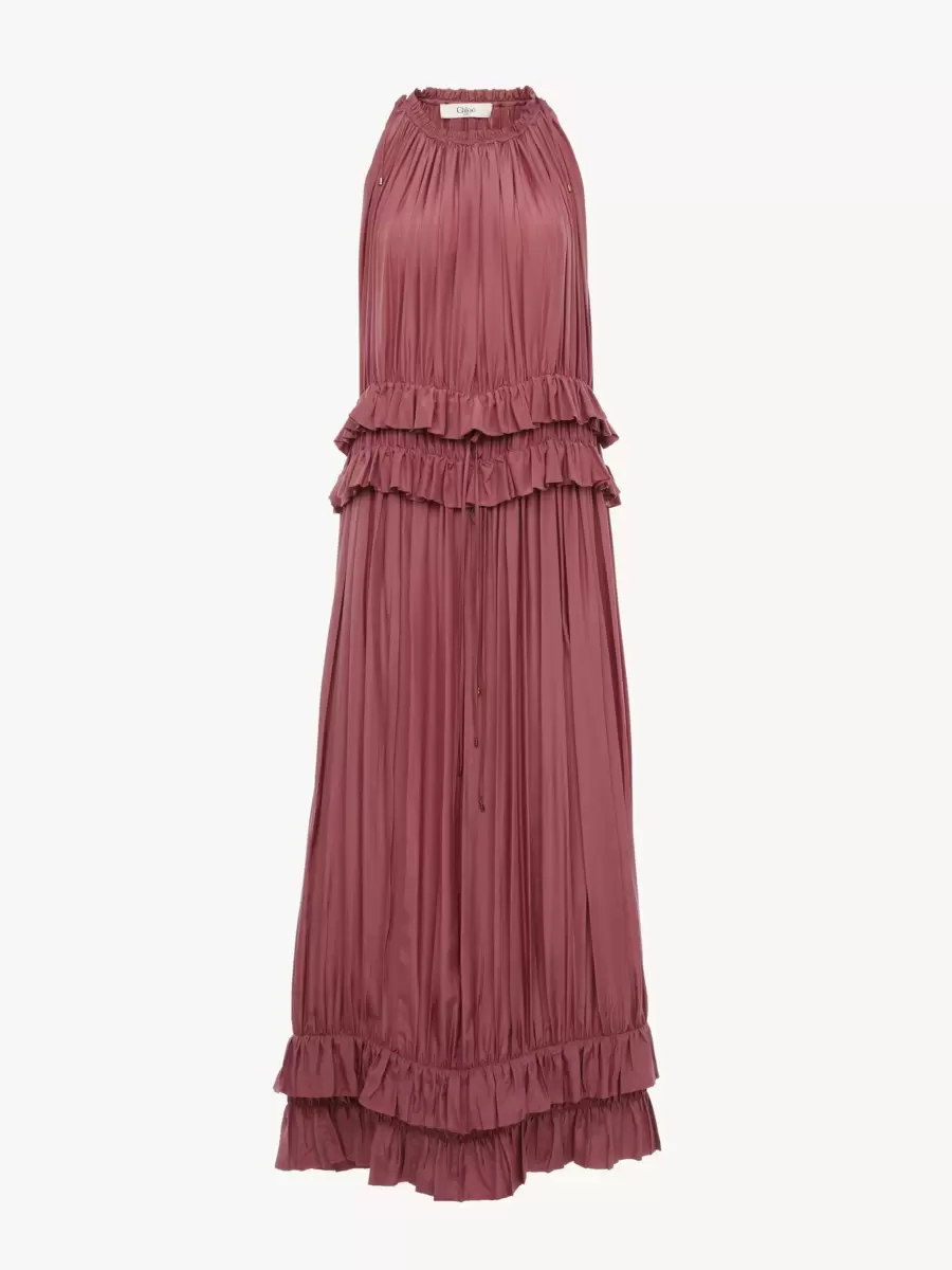 Ärmlös lång klänning i tvättad sidenpongé med en samlad, skiktad silhuett och volangkanter. Dragsko i halsen och midjan fästs med dinglande band med guldfärgade metallspetsar.