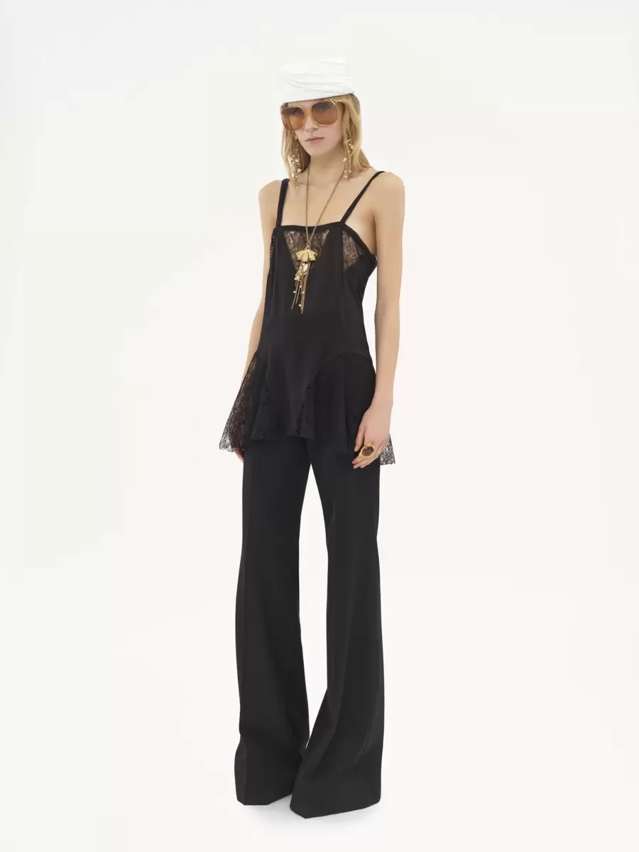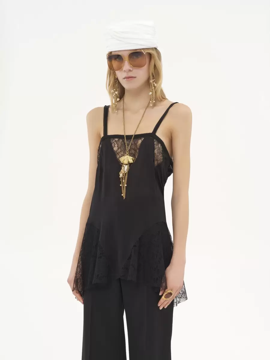 Ärmlös miniklänning i lätt sidencharmeuse med spetskanter vid halsringning och kjol, tunna axelband och tygklädda knappar i sidan.