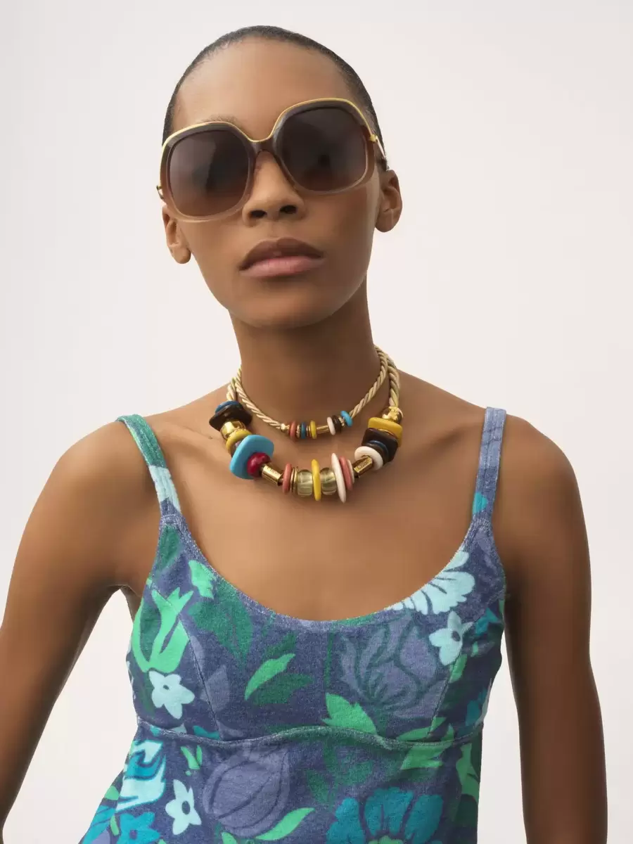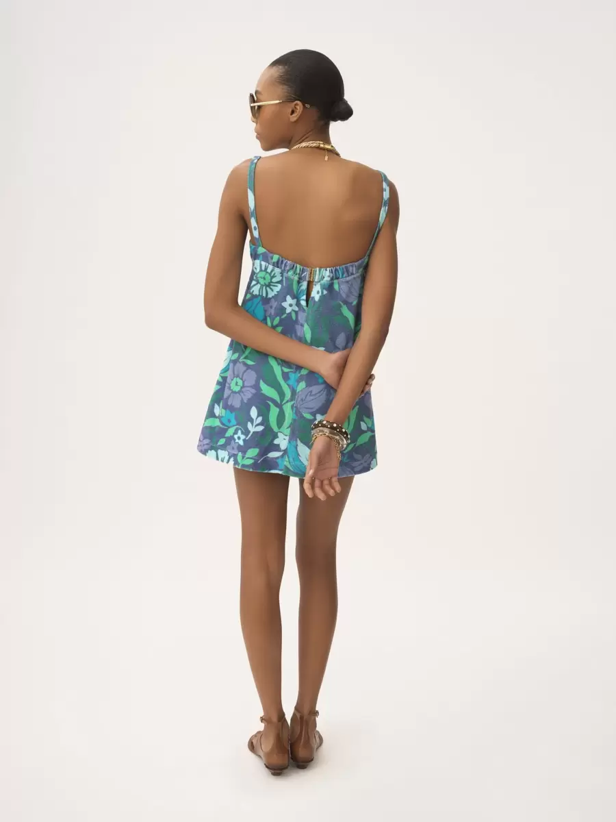 Miniklänning med tunna remmar i bomullsjersey med ett heltäckande blomtryck med Chloé-logotypen. Öppen övre del av ryggen och ett Chloé-graverat spänne fulländar detta plagg.
