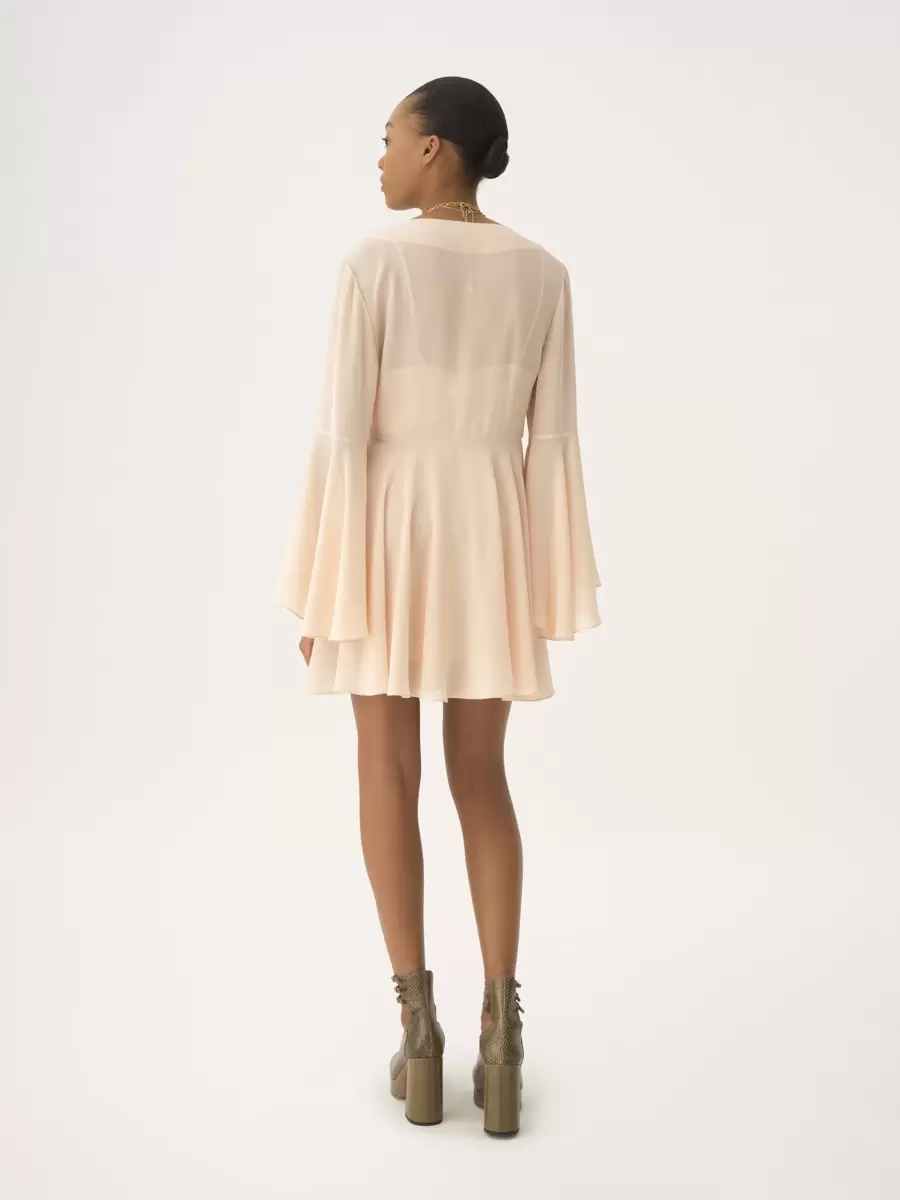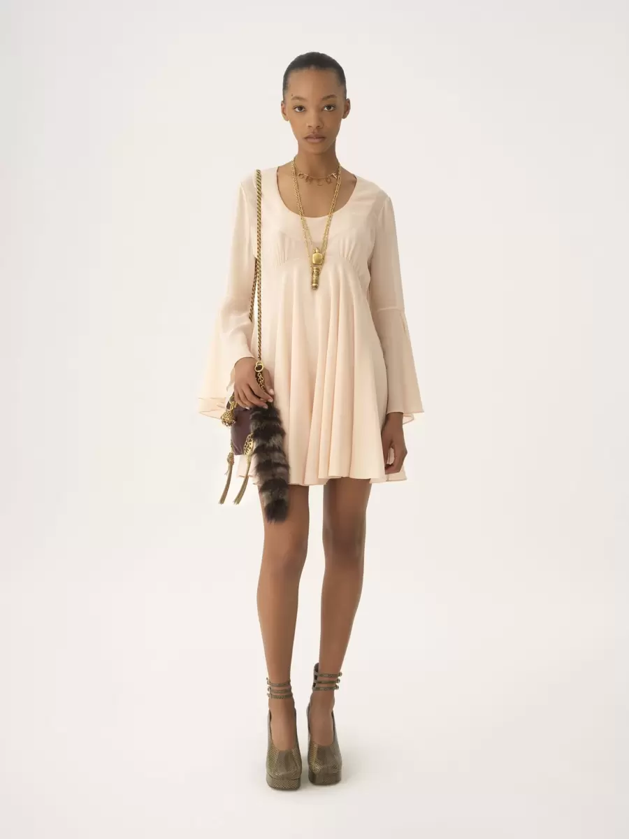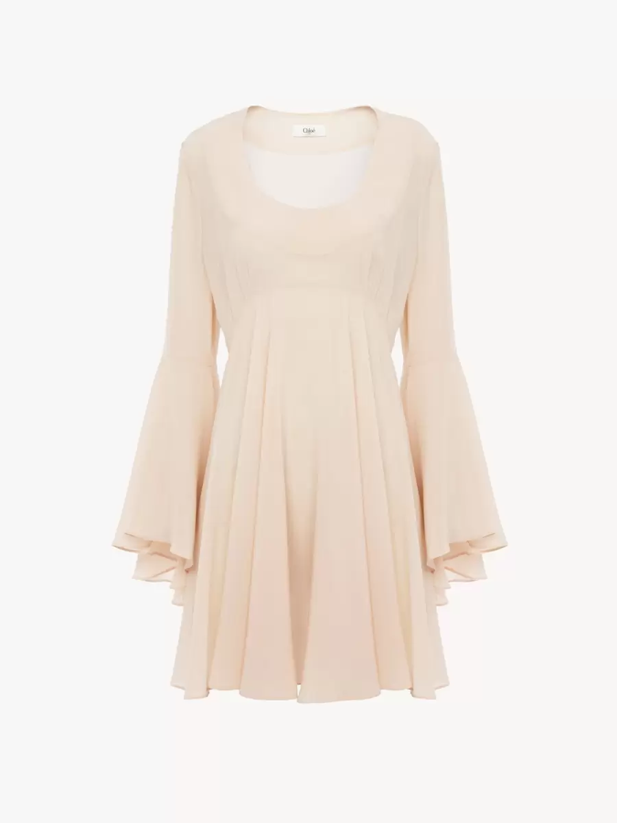 Utställd miniklänning med rund halsringning i ekologisk sidengeorgette med foder i sidenblandning.