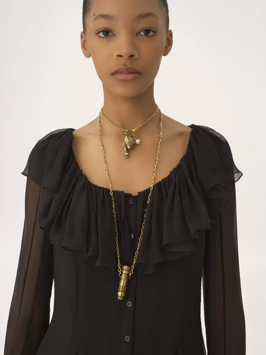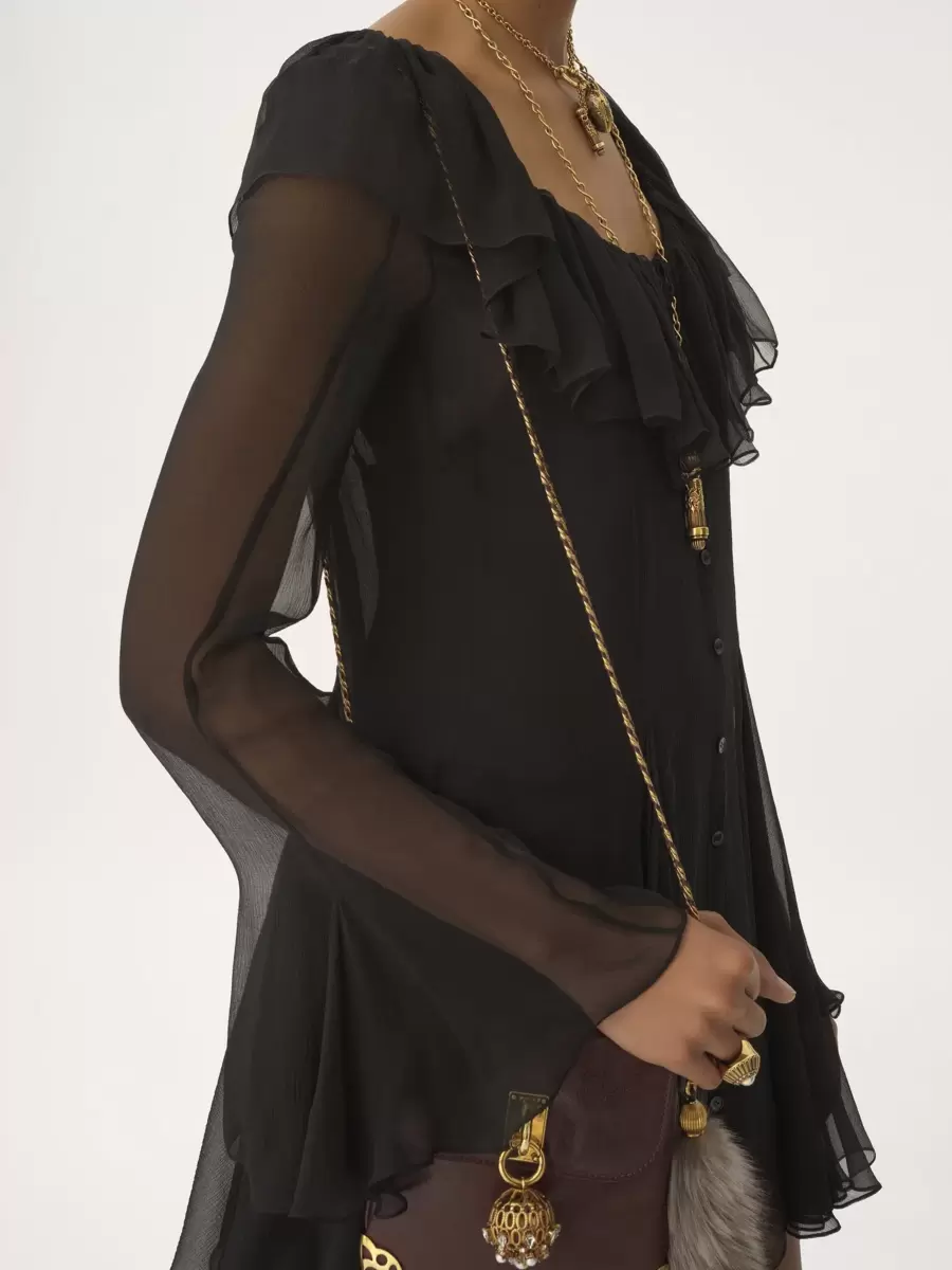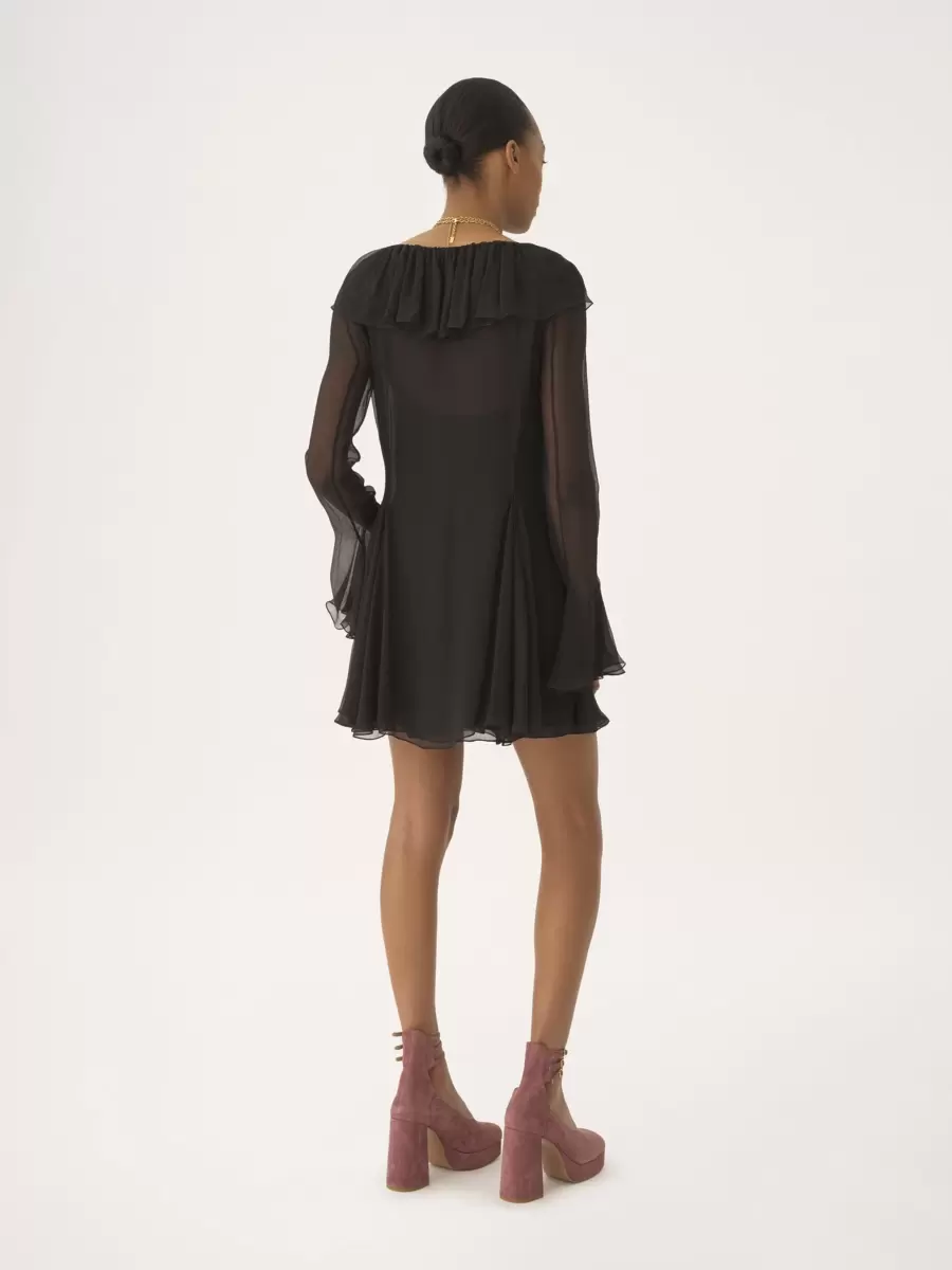 Uppringad utsvängd miniklänning i ekologisk sidenmousseline med ett foder i sidenblandning, med volangdetaljer och pärlemorknappar.