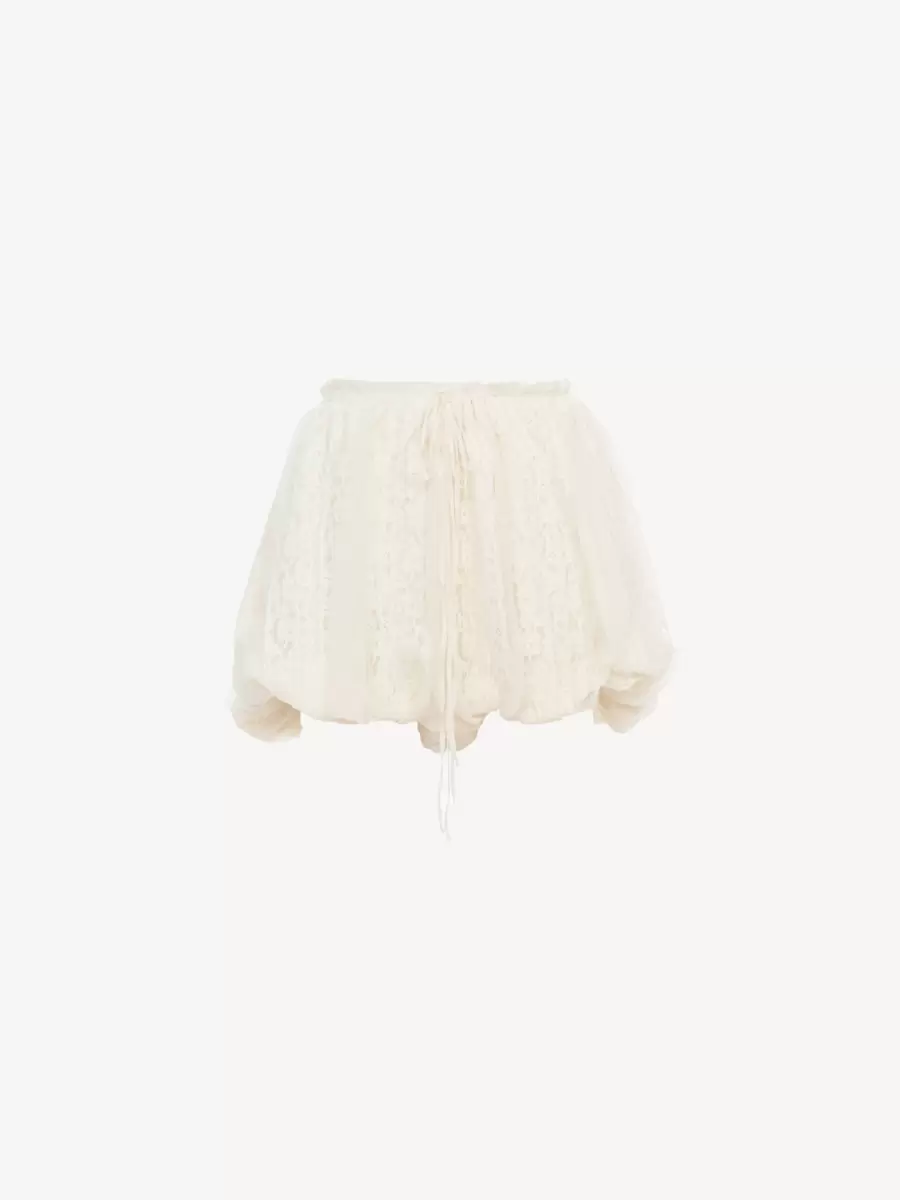 Flydande, rynkade mini-bloomershorts i ekologisk sidenmousseline med blommiga spetsutsmyckningar och foder i sidenblandning. Dragsko i midjan har dinglande knytband med guldfärgade spetsar.