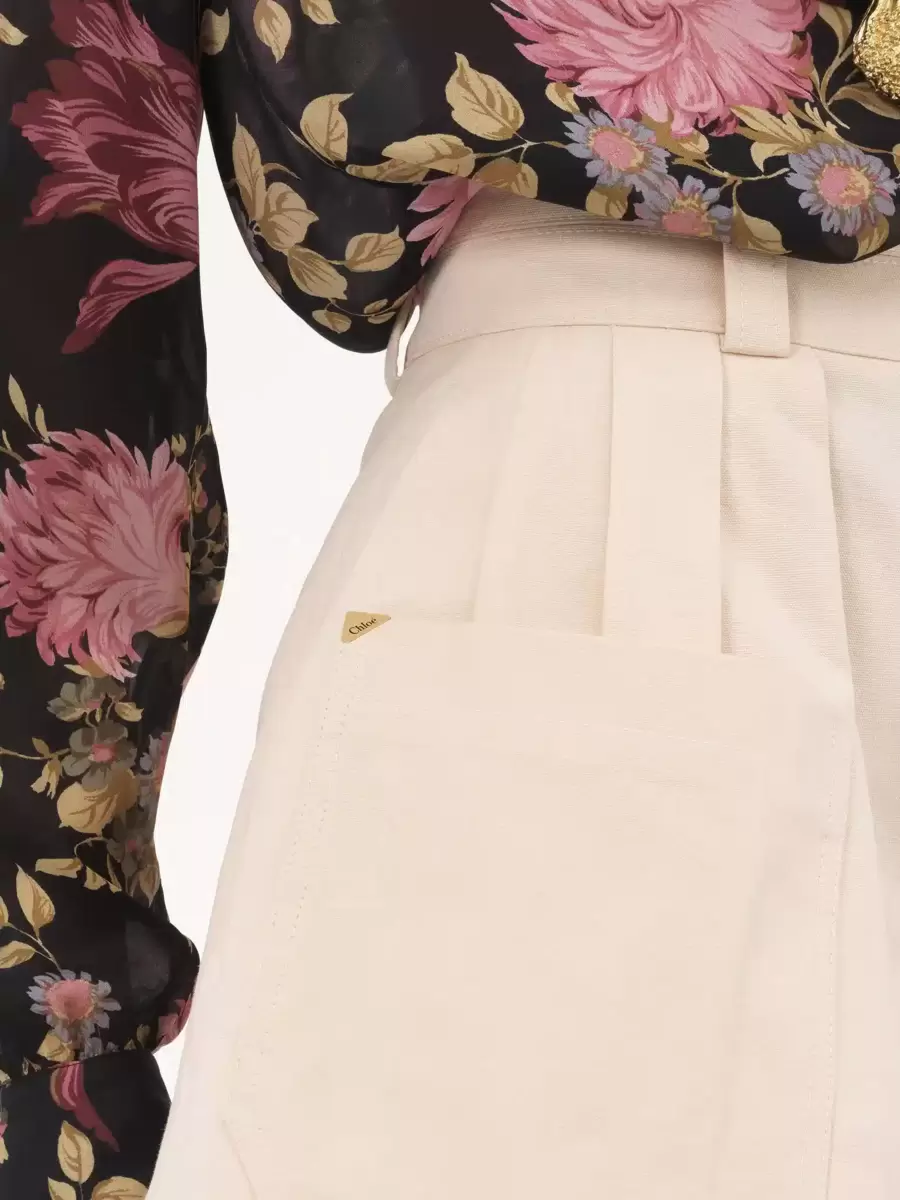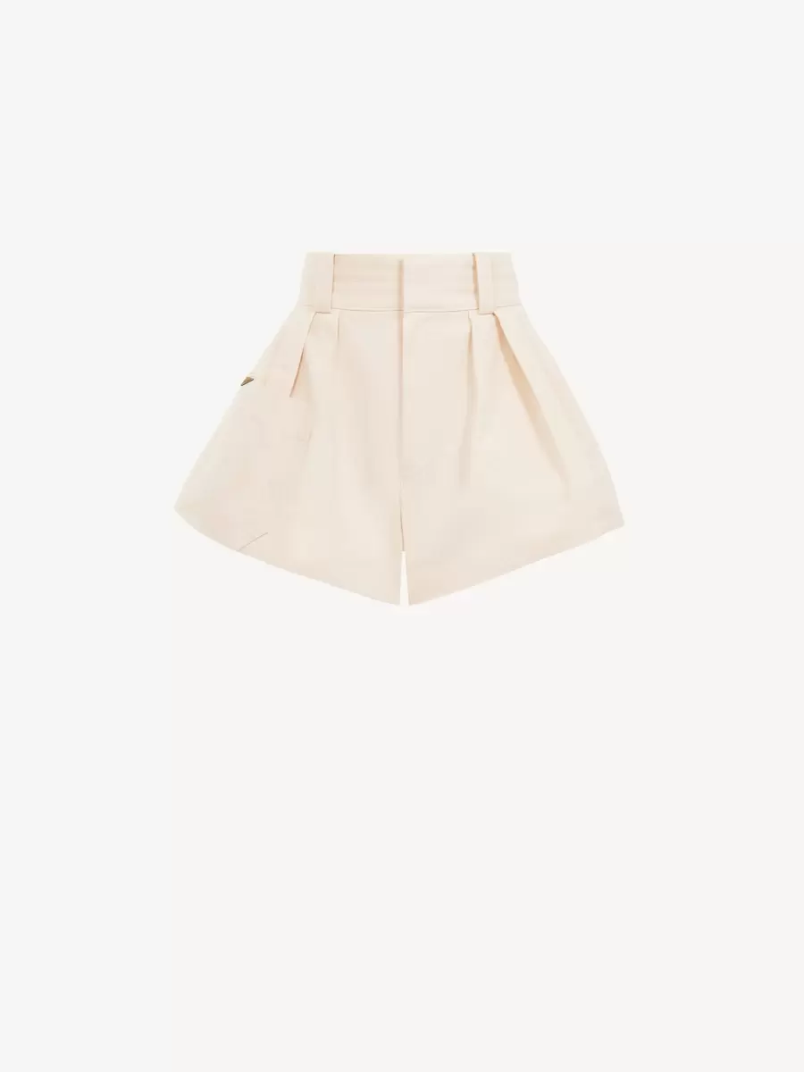 Högmidjade minishorts i plaggfärgad ekologisk bomullscanvas med veck och en asymmetrisk framficka med detaljerad Chloé-logotriangel i guldfärgad metall.