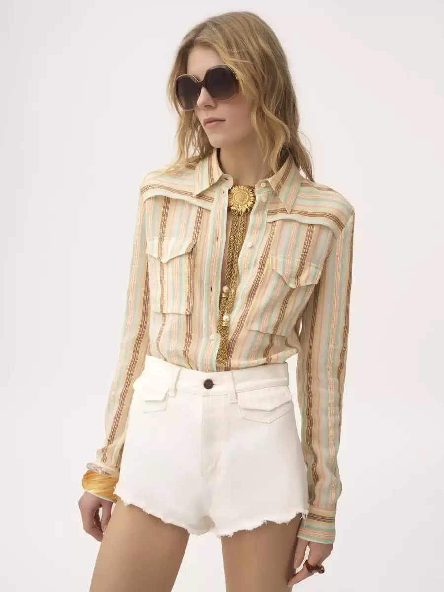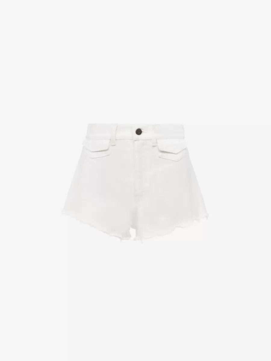 Högmidjade minishorts i ekologisk bomullsdenim med minifickor med lock och fransade kanter. En Chloé Paris-logotyplapp i läder märks baktill.