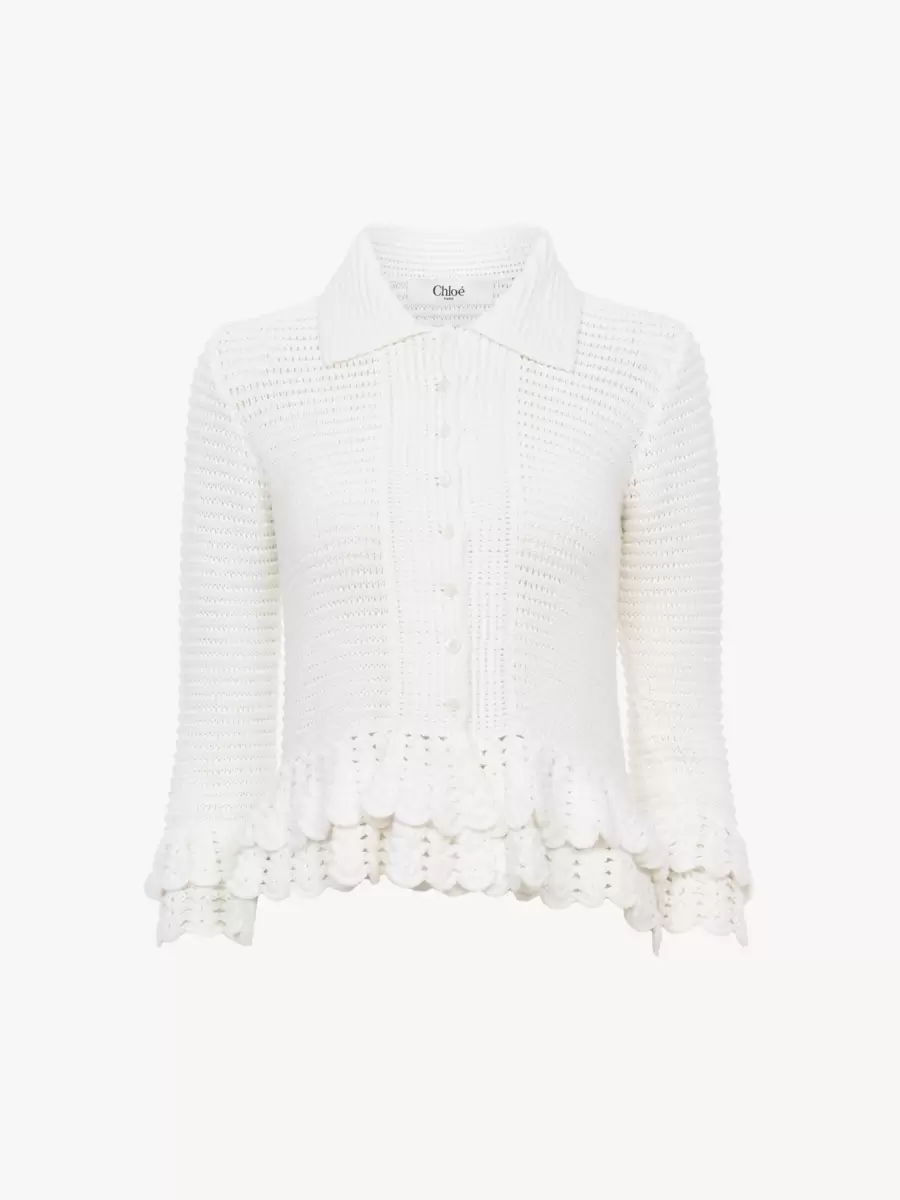 Avsedd kofta med volanger i virkad stickning med pärlemorknappar och lager-på-lager-volanger vid fåll och ärmslut.