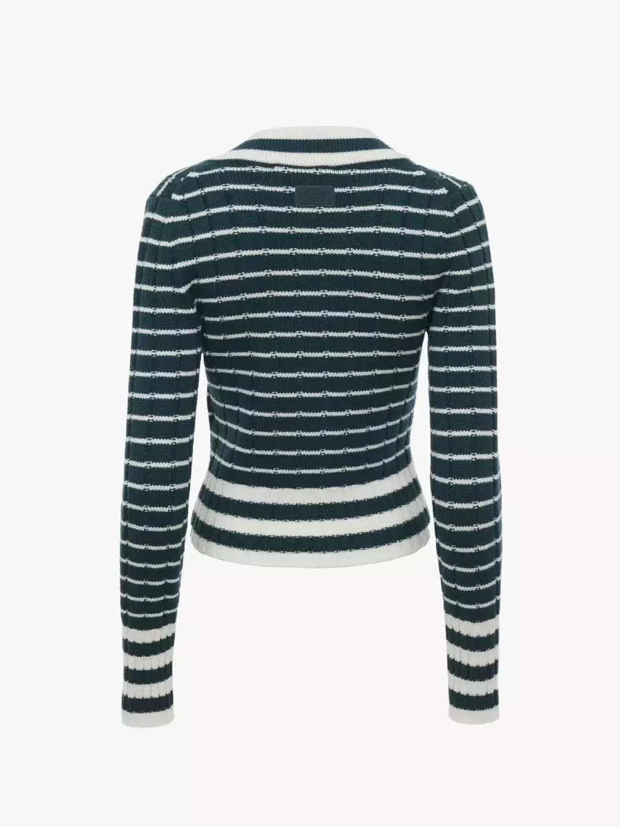 V-ringad, figurnära tröja i merinoull med ett samspel av tjocka och tunna ränder.
