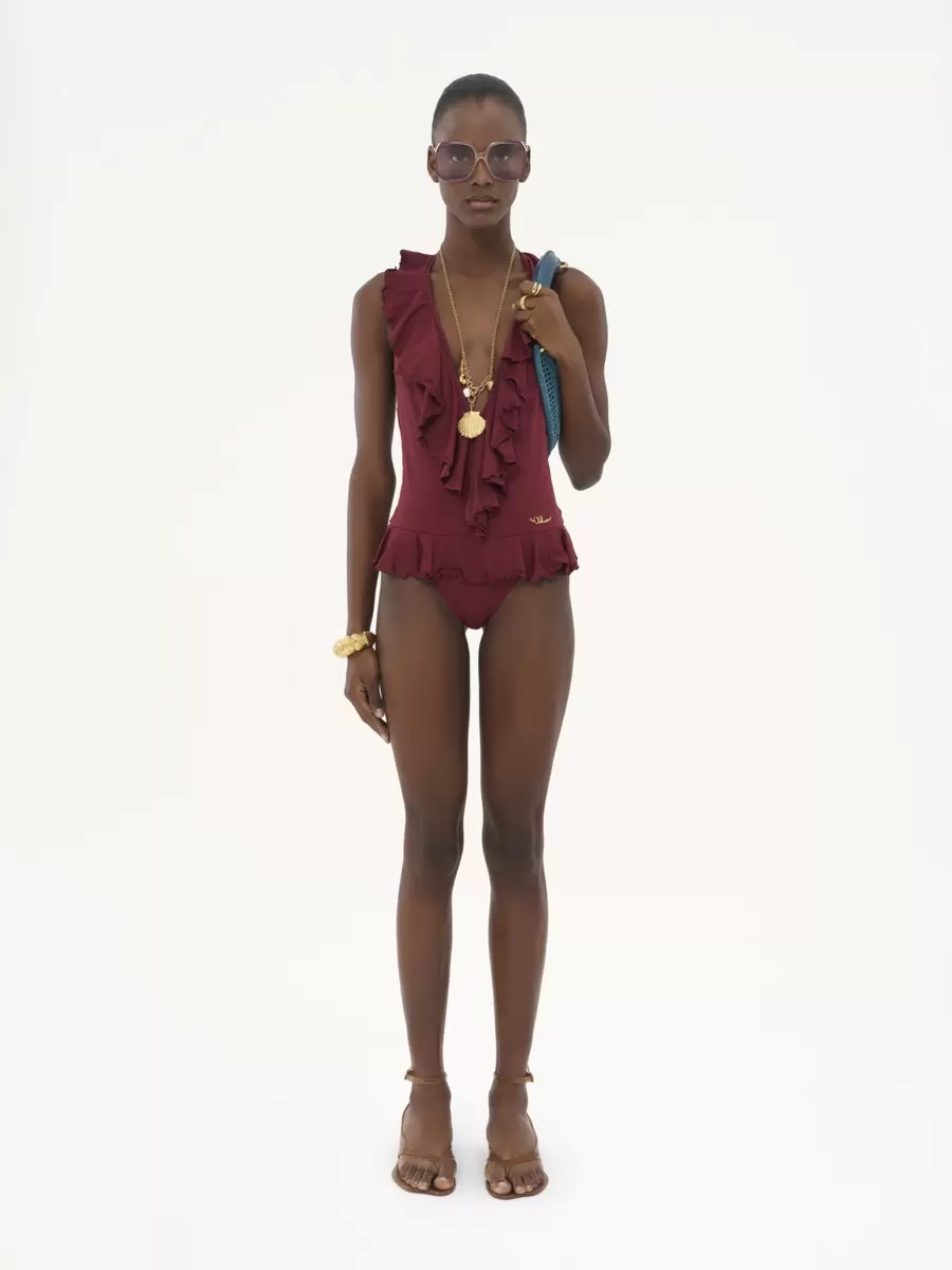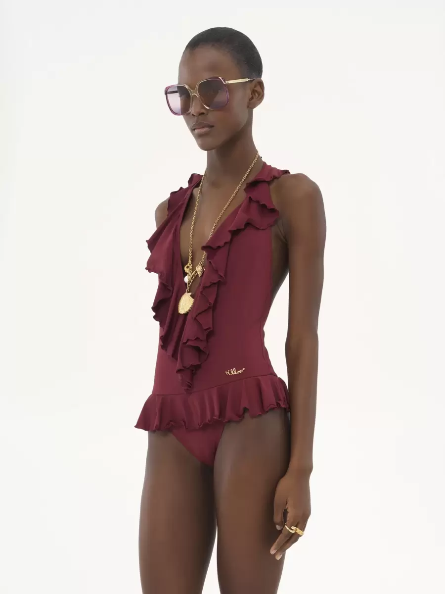 Baddräkt i en återvunnen polyamidmix med matt finish, med djup V-ringning och volanger längs halsringningen och höfterna. En guldfärgad Chloé-logotypplatta markerar vänster höft.
