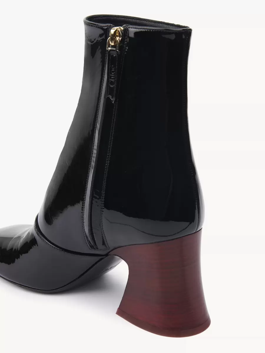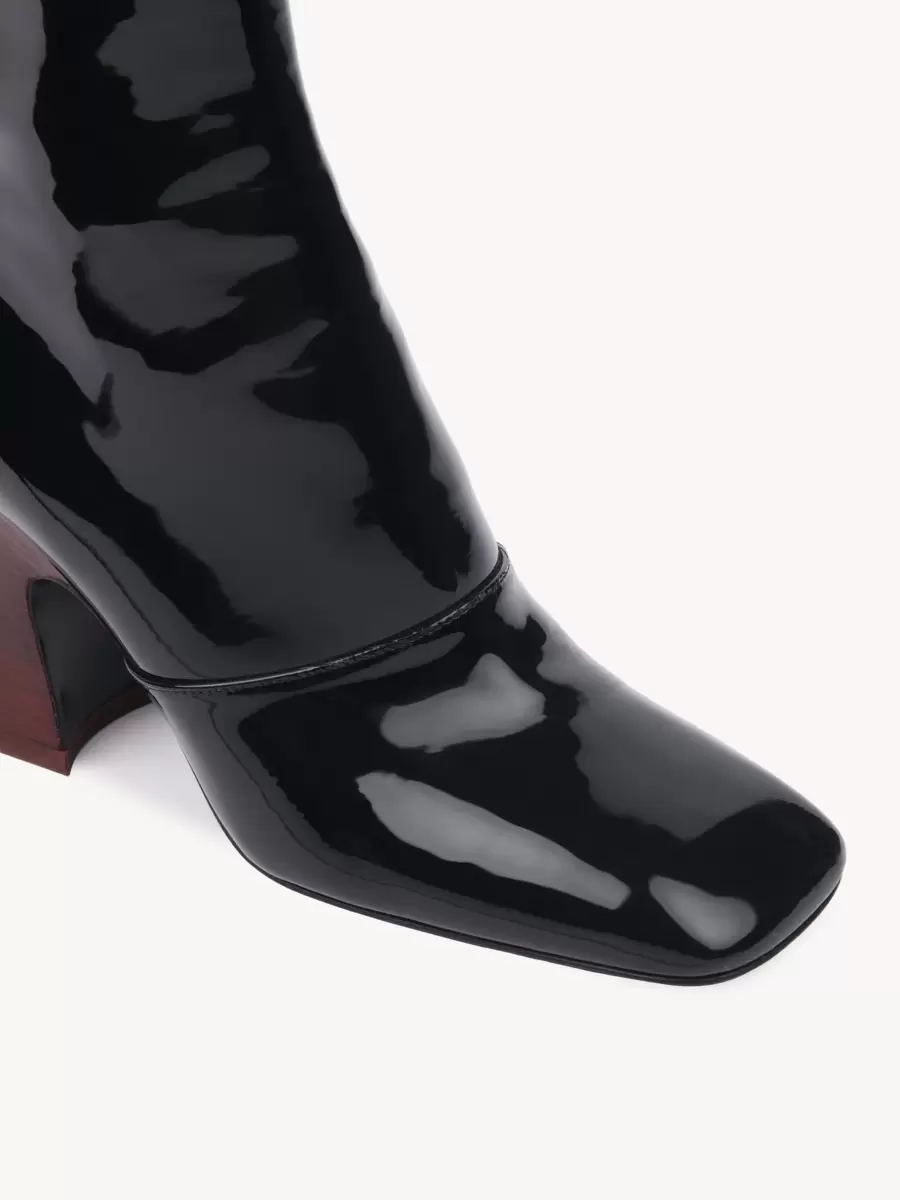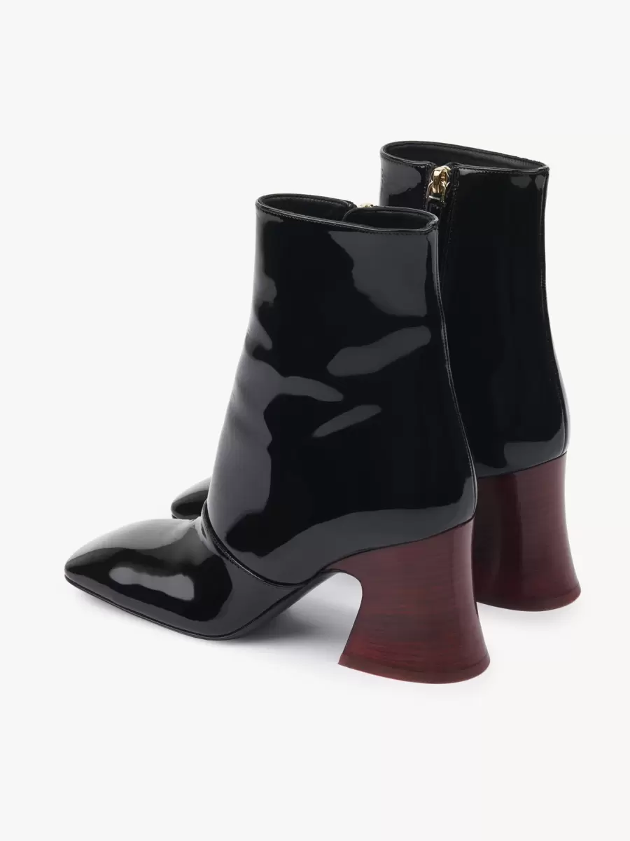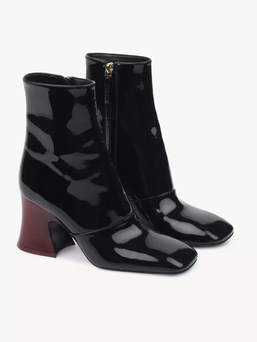 Tillverkade av lackerat kalvskinn, kombinerar dessa Janis-klackade ankelboots en elegant, figurnära silhuett med en subtil fyrkantig tåform. Den kontrasterande staplade, utsvängda hälen garanterar bekväm användning.