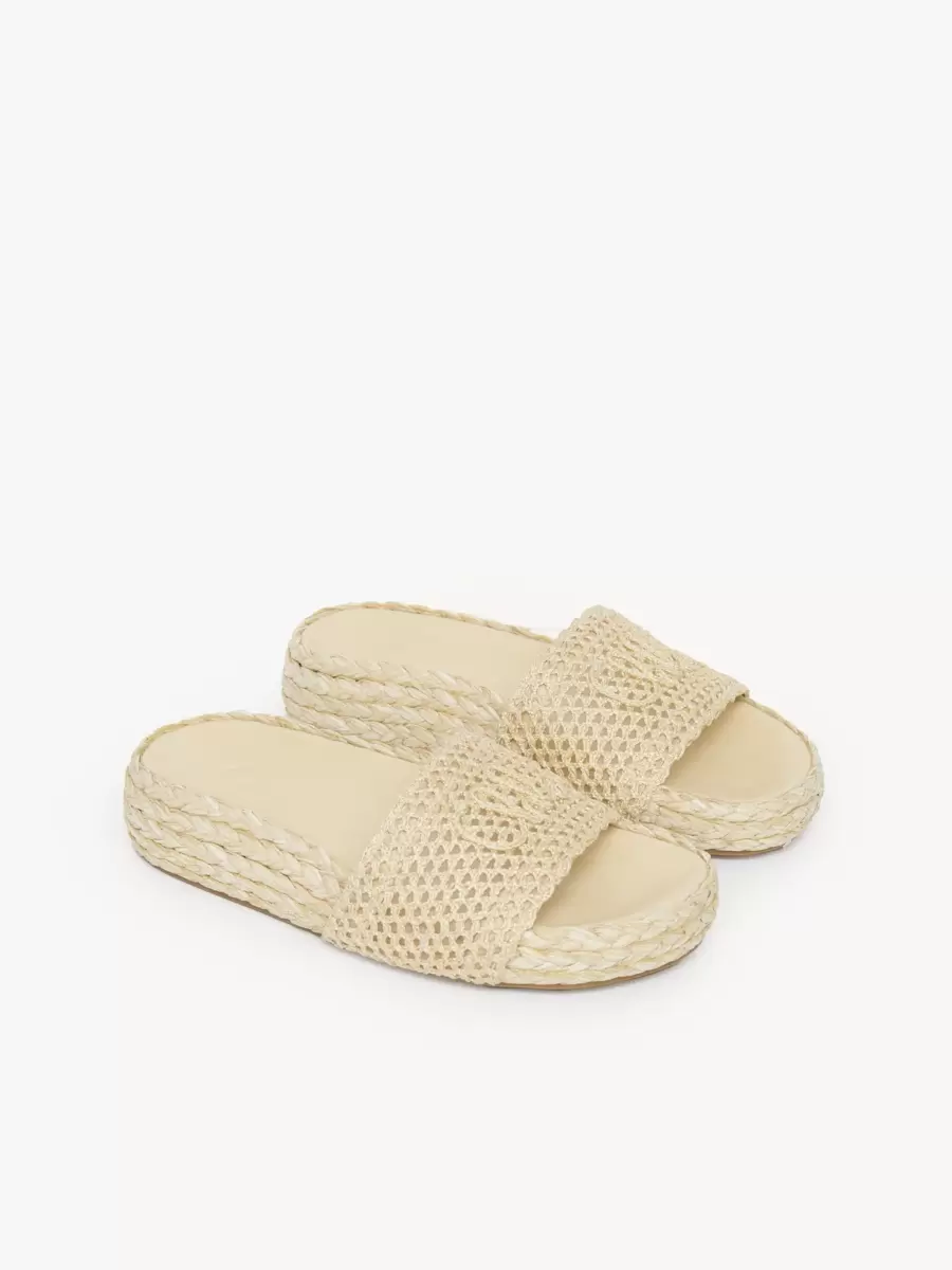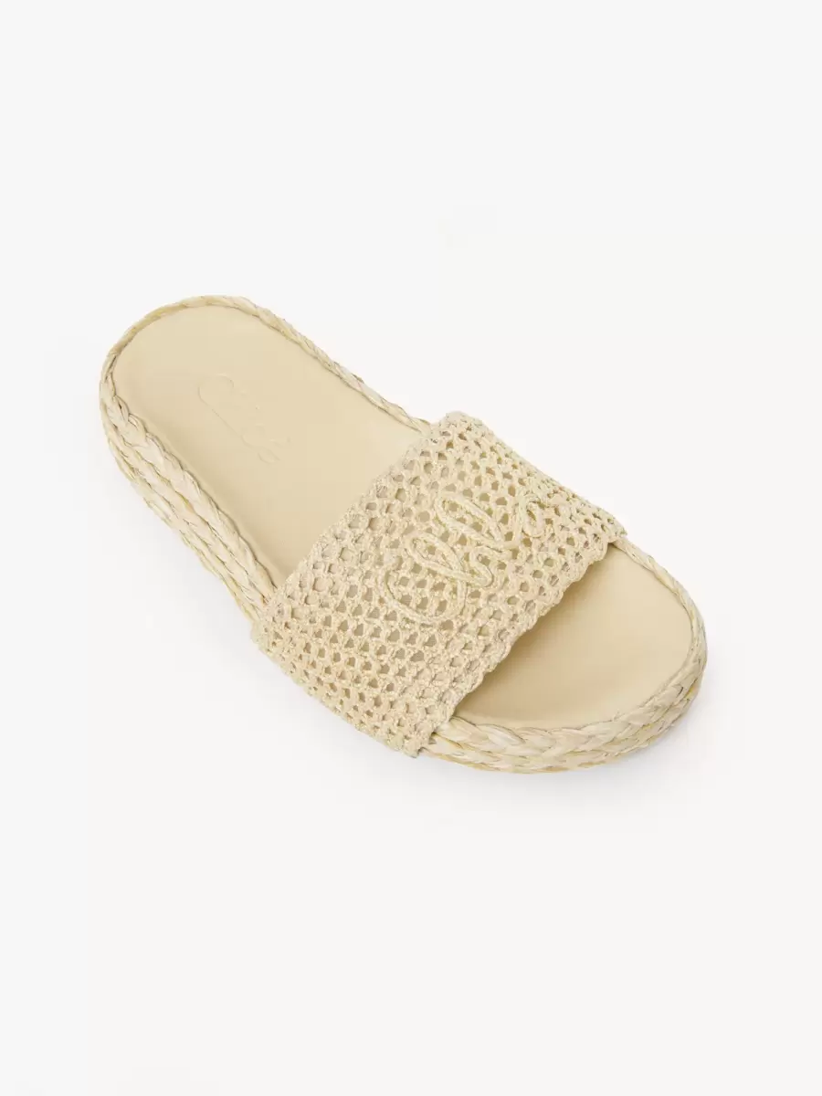 Dessa Isla platta sandaler kombinerar en ovandel i virkad raffia med en sula i naturlig manchester. Framsidan är broderad med en handskriven signatur inspirerad av ett vintage Chloé-bälte.