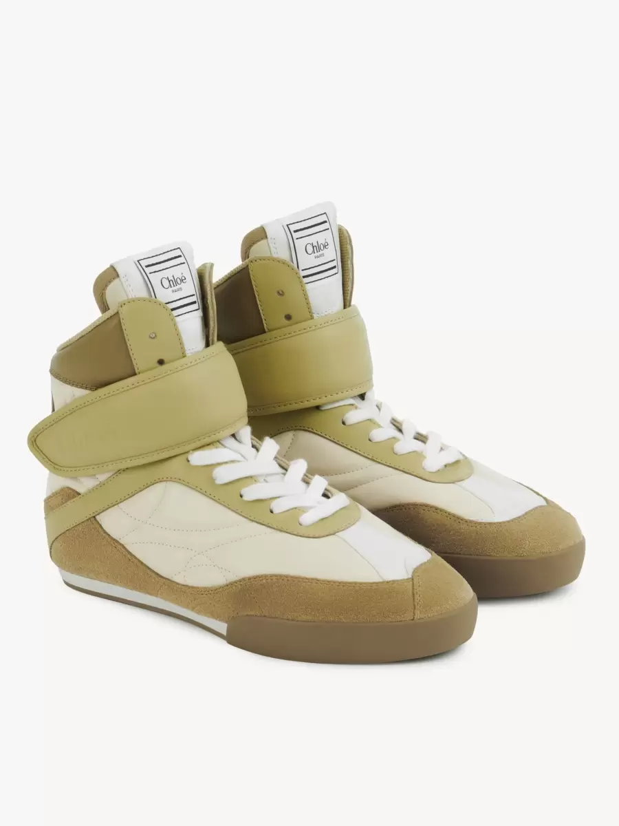 Inspirerade av balett- och boxningsvärlden är dessa Chloé Kick höga sneakers tillverkade av en blandning av slät kalvskinn och mocka. Den smala silhuetten kombinerar en mandelfärgad tå med en hög ankel som fästs av ett brett läderband med Chloé-logotypen präglad.