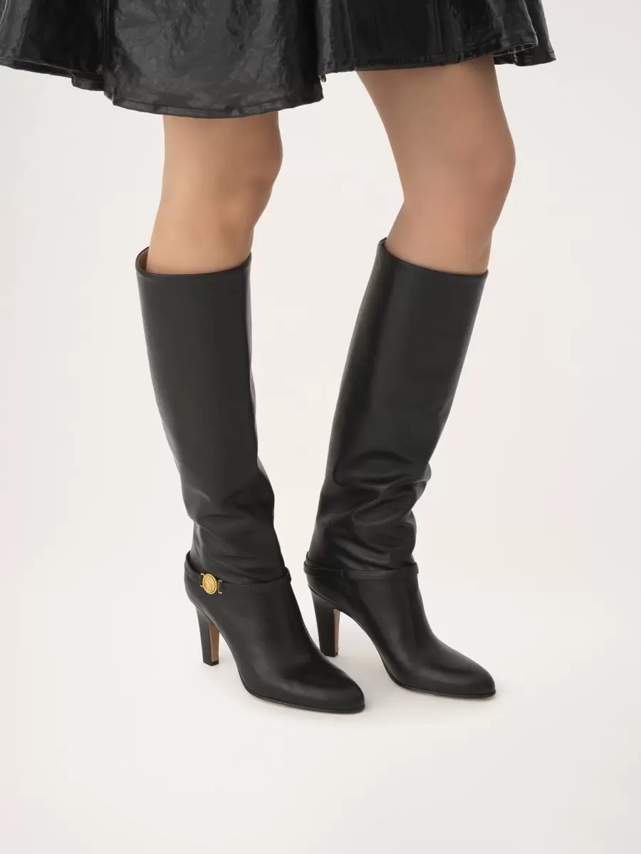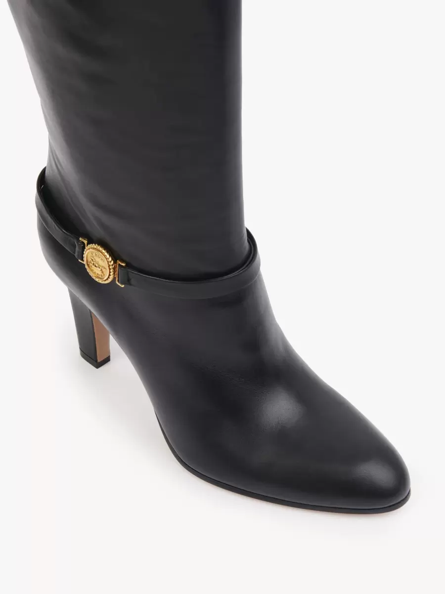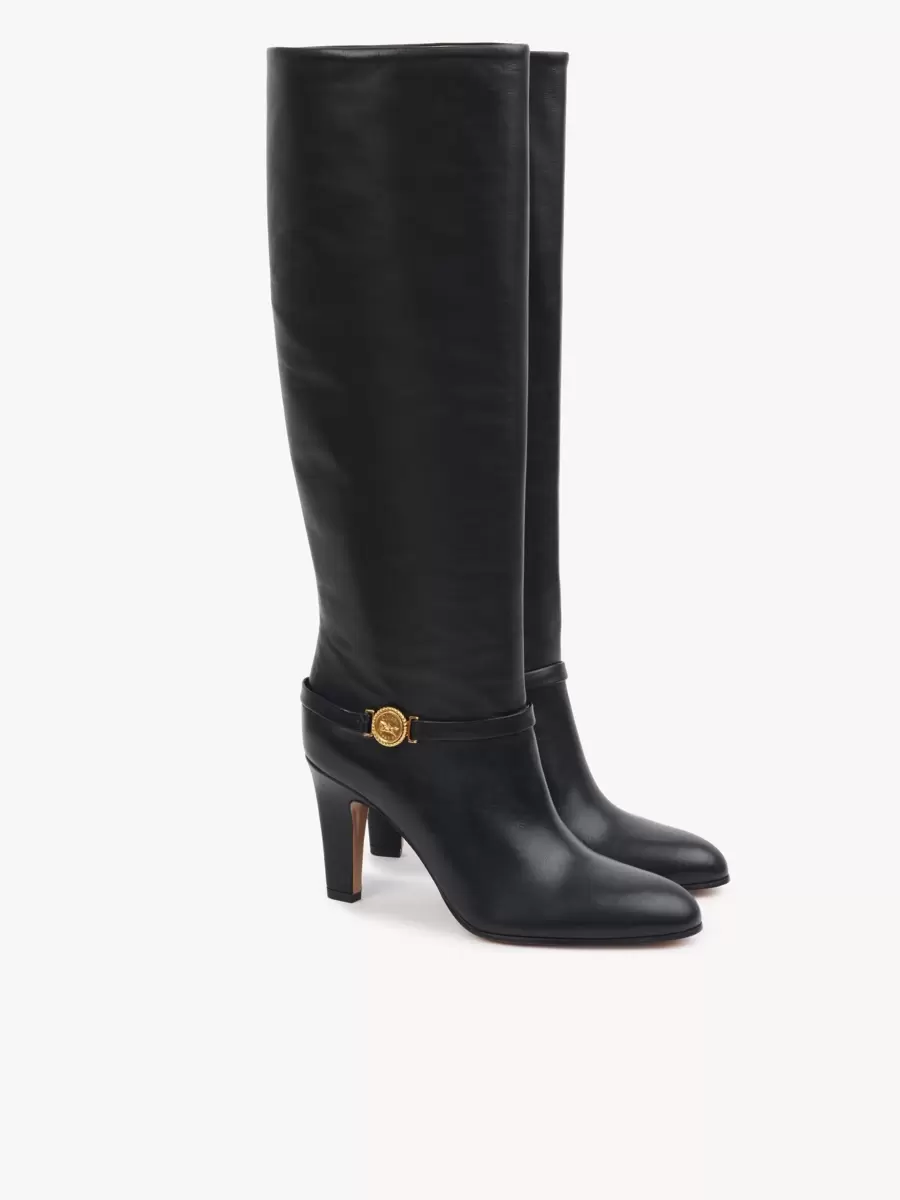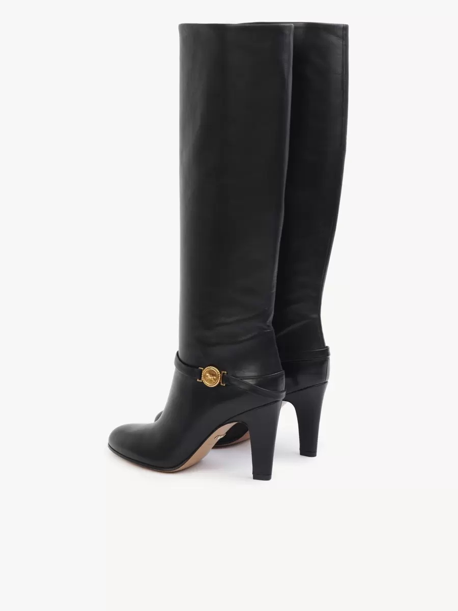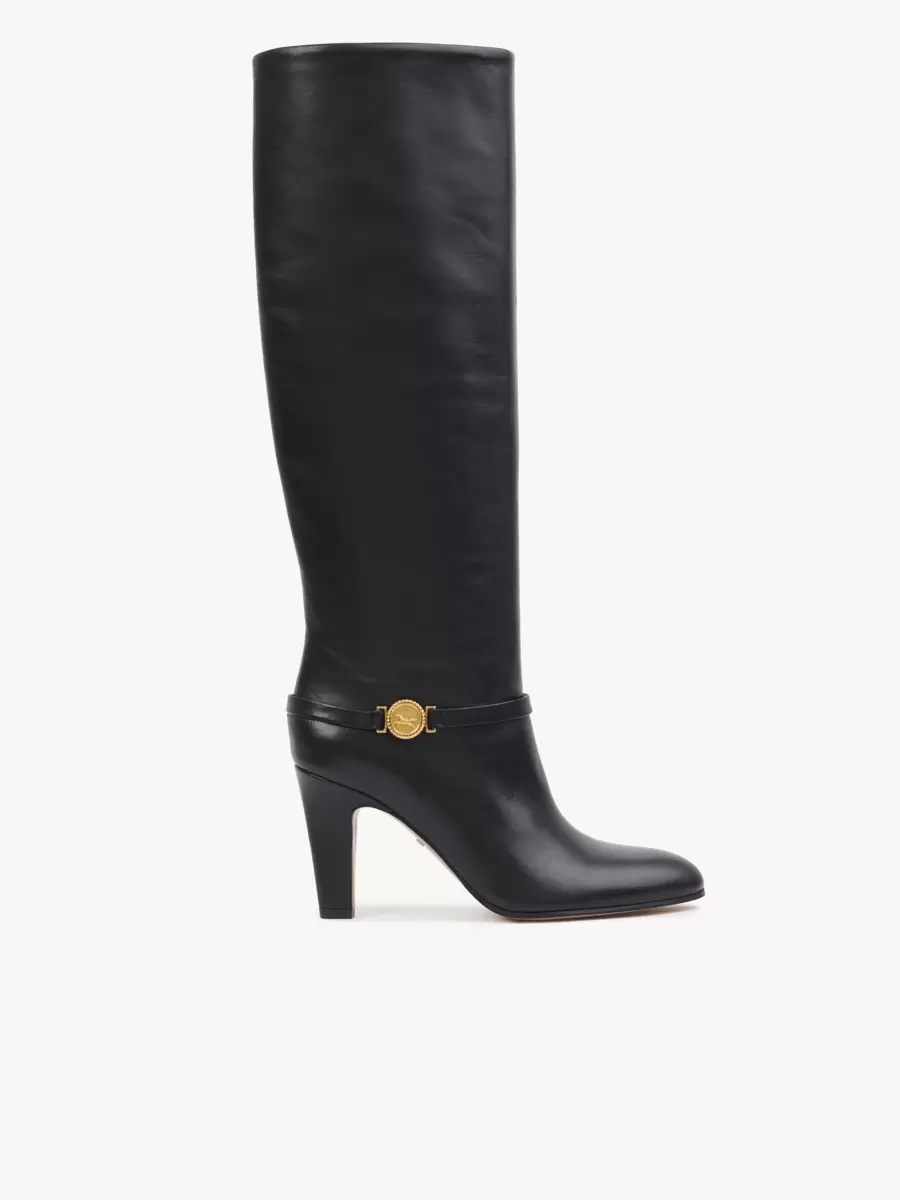 Tillverkade av smidigt glänsande kalvskinn kombinerar Eve-klackstövlarna ett högt rörben med en avsmalnande klack och en klassisk spetsig tå. Ett läderband runt vristen är utsmyckat med Maisons signatur guldfärgade hästmedalj.