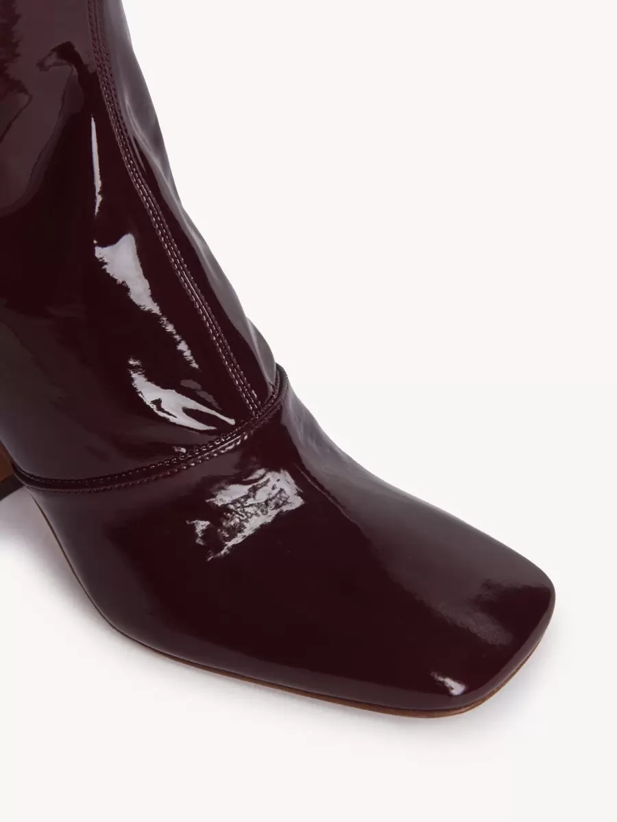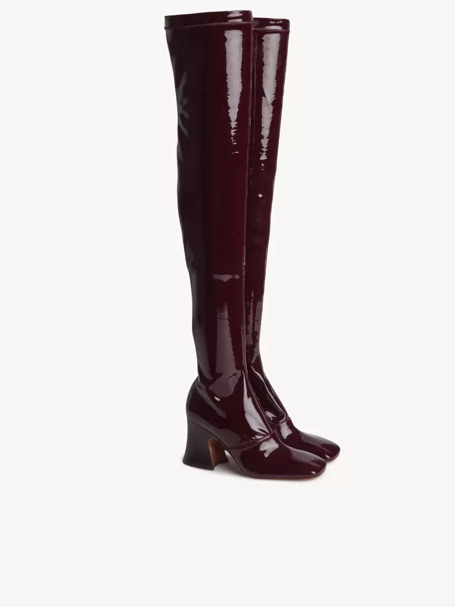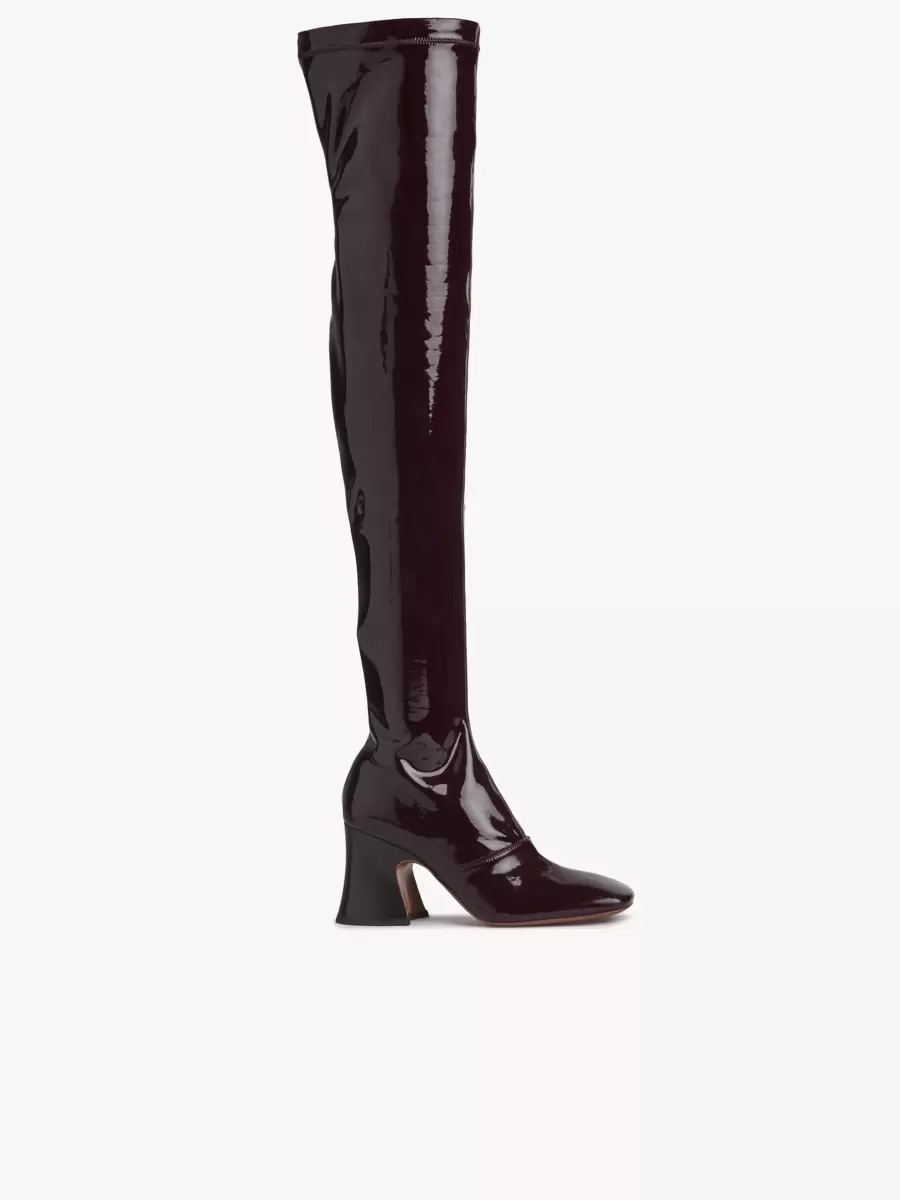 Dessa Janis over-the-knee-stövlar är tillverkade av stretchigt textil med patentliknande effekt. De har en kontrasterande staplad, utsvängd klack och en hög rörformad benform med en subtil fyrkantig tå.