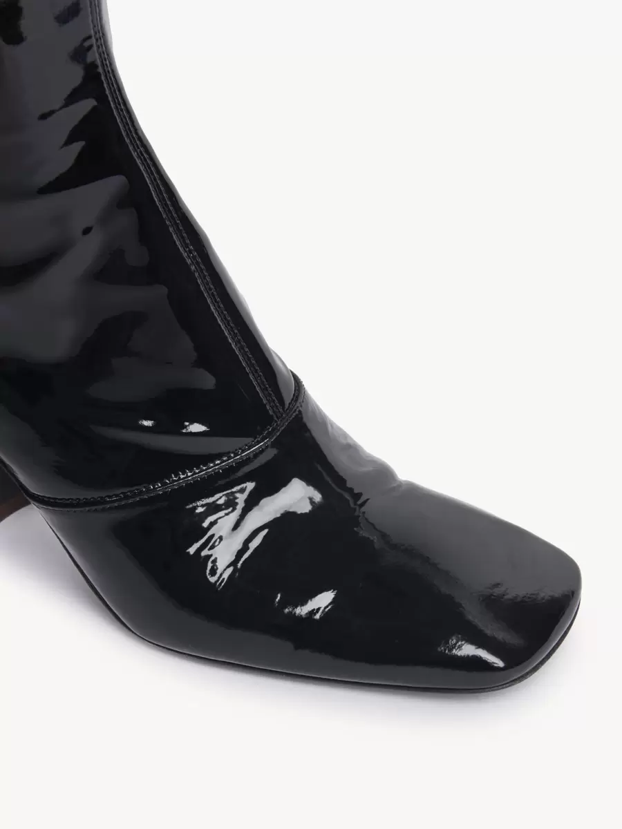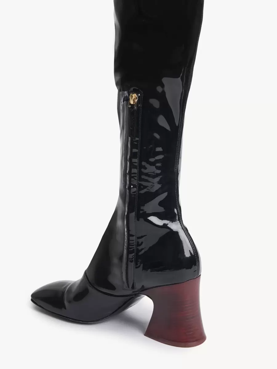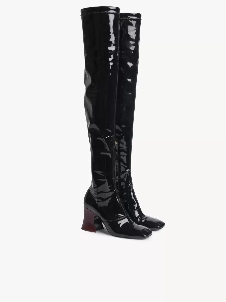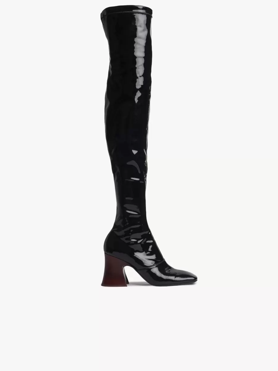 Dessa Janis over-the-knee-stövlar är tillverkade av stretchigt textil med patentliknande effekt. De har en kontrasterande staplad, utsvängd klack och en hög rörformad benform med en subtil fyrkantig tå.