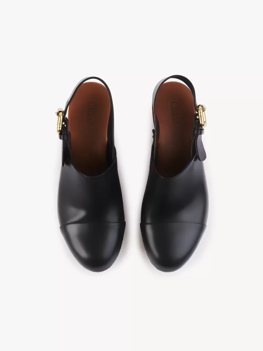 Dessa Jeannette-träskor omtolkar en ikonisk Chloé-form i en lägre silhuett. Den glänsande kalvskinnsodelen kombineras med en justerbar fotledsrem och en rejäl träplattform med kil.