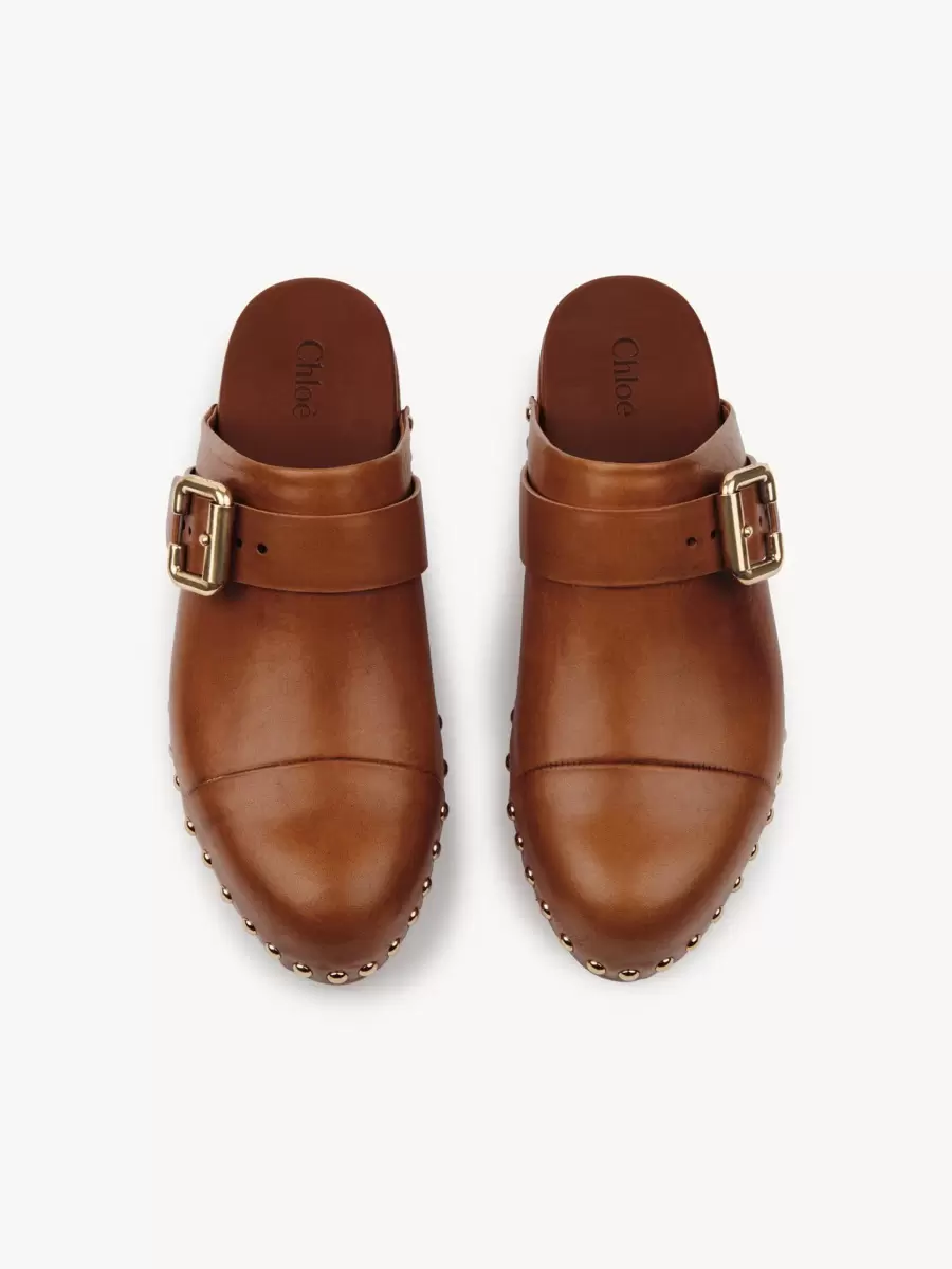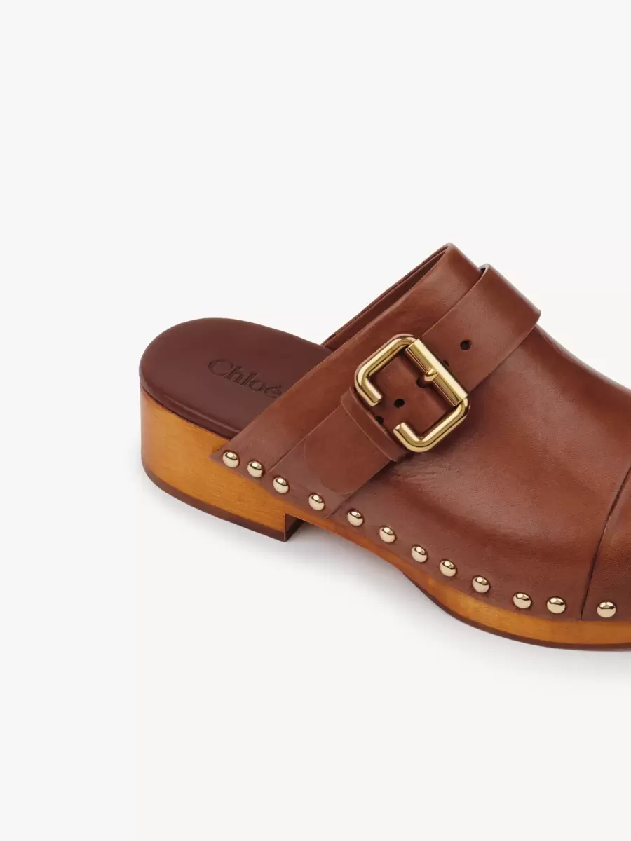 Guldfärgade nitar och Maisons ikoniska Paddington-spänne avslutar dessa platta träskor.