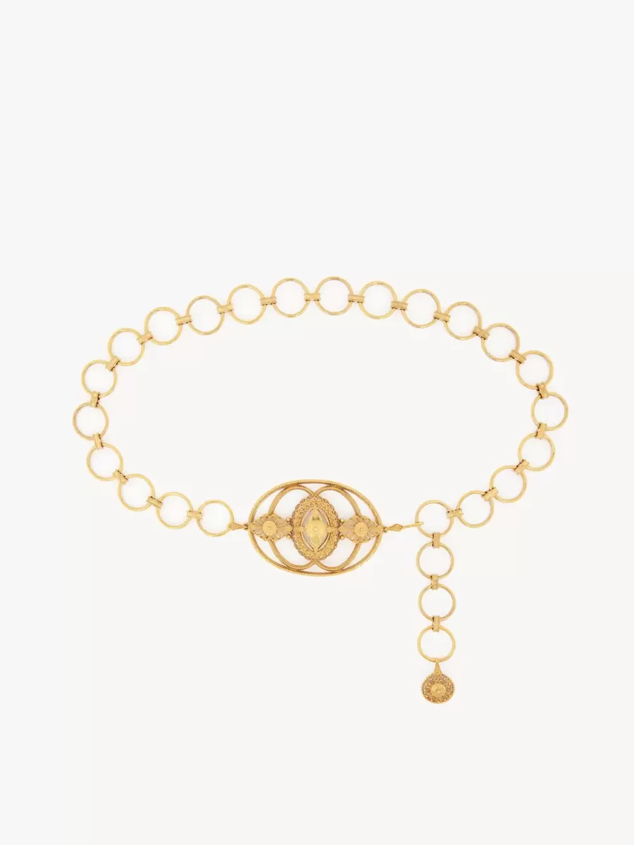 Chloé Amulet smyckesbälte i vintage guldmässing, med runda länkar och ett noggrant skuret, iögonfallande ornamentalt spänne. Ett matchande hänge dinglar längs benet. Den justerbara kedjan är signerad med en Chloé-logotypgravyr och har en hyskstängning.