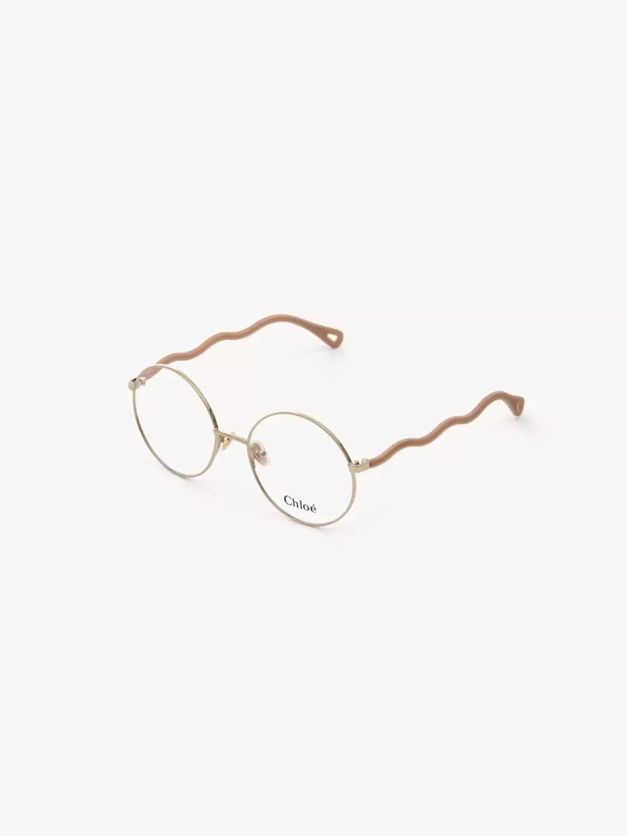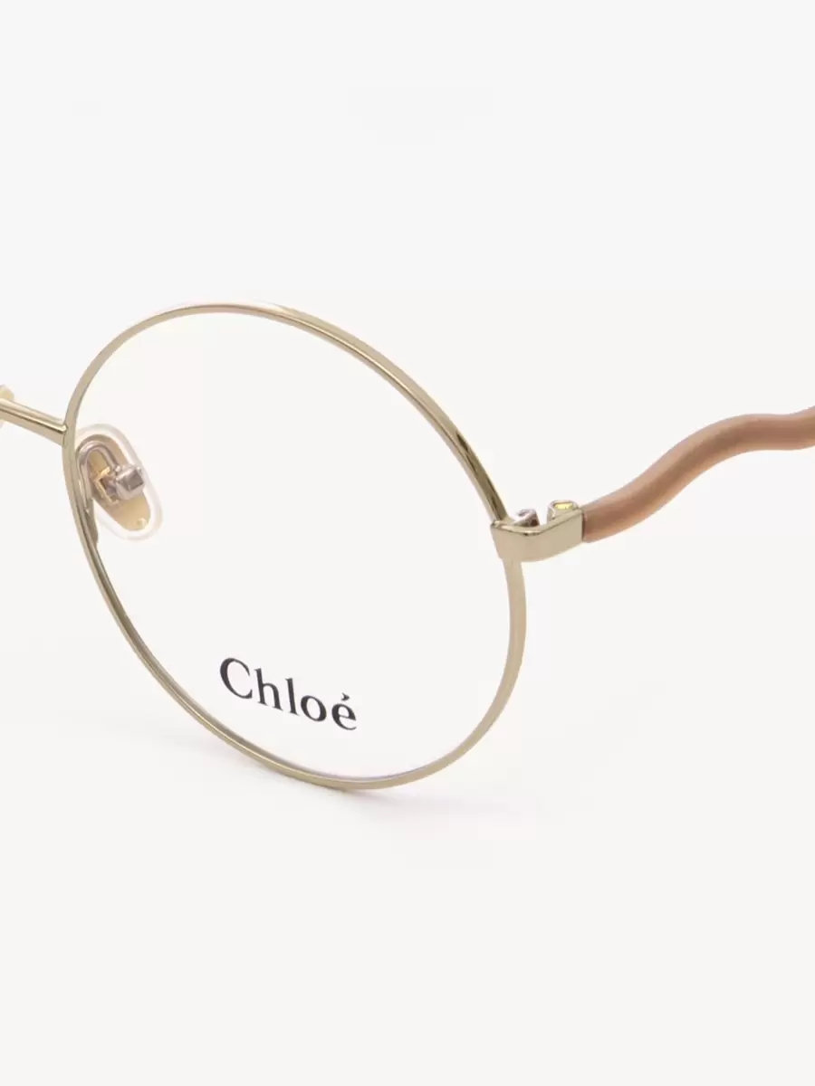 Inspirerade av Chloés ikoniska vågiga skalmar utstrålar de runda Noore-glasögonen en feminin, lekfull attityd med en lättburen form. Den sandfärgade metallbågen och de bruna skalmarna skapar en neutral färgpalett.