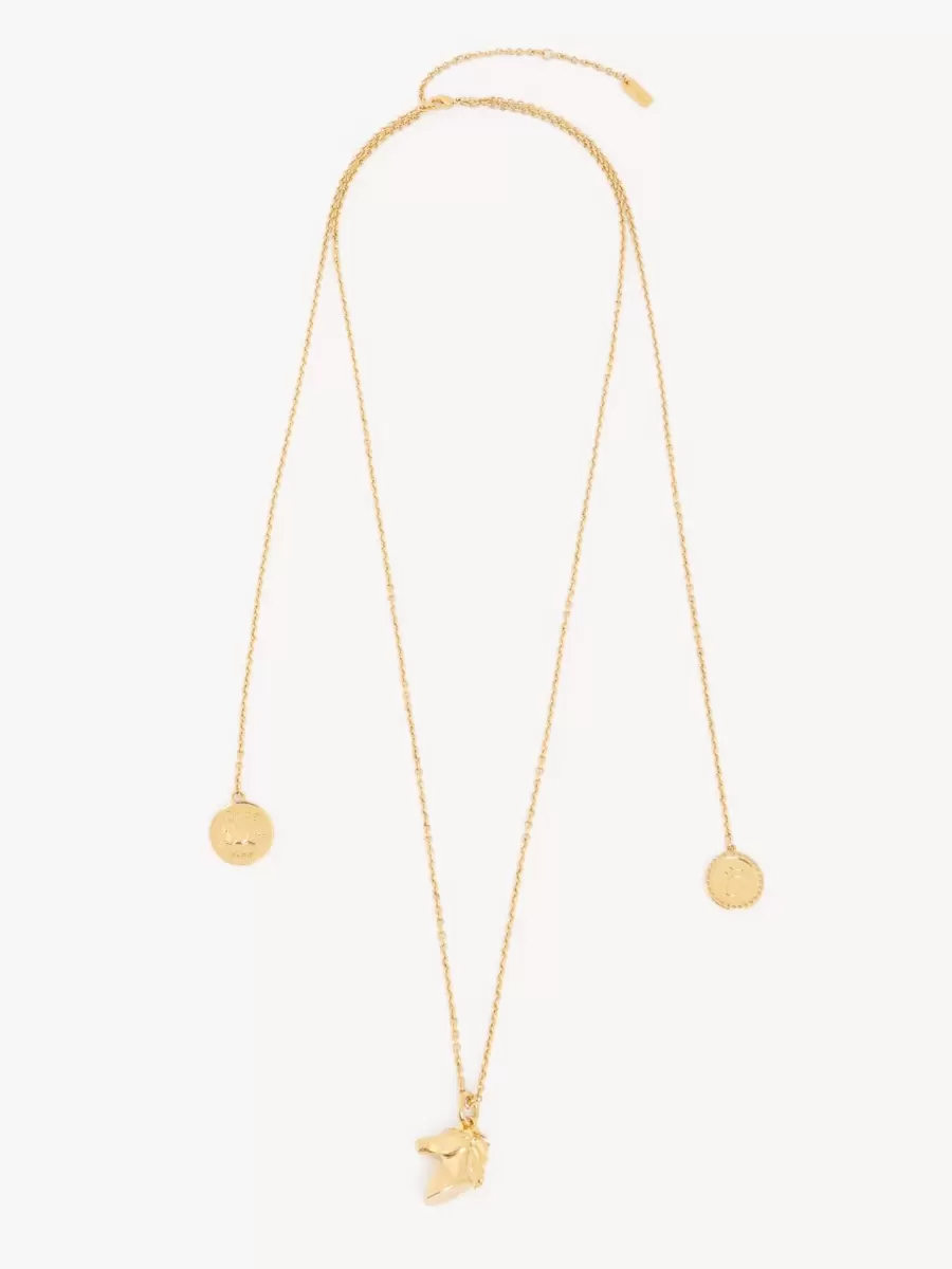 Chloé Charms-halsband i vintage guldmässing. En justerbar dubbelkedja är detaljerad med tre hängen rotade i Maisons DNA: ett hästhuvud och två medaljer, ett konturerat med en spetseffekt och det andra signerat med Chloé Paris-logotypen. En Chloé-logotypetikett signerar detta smycke.