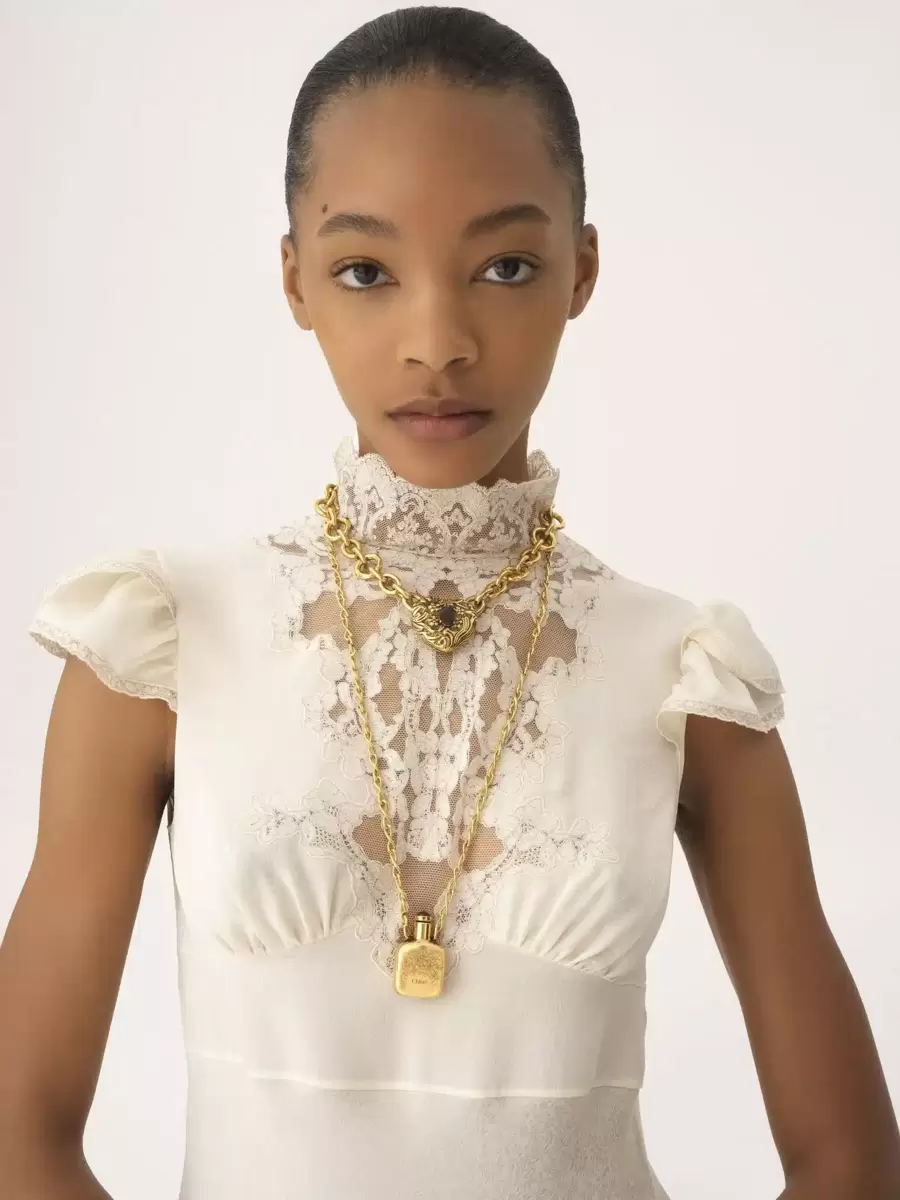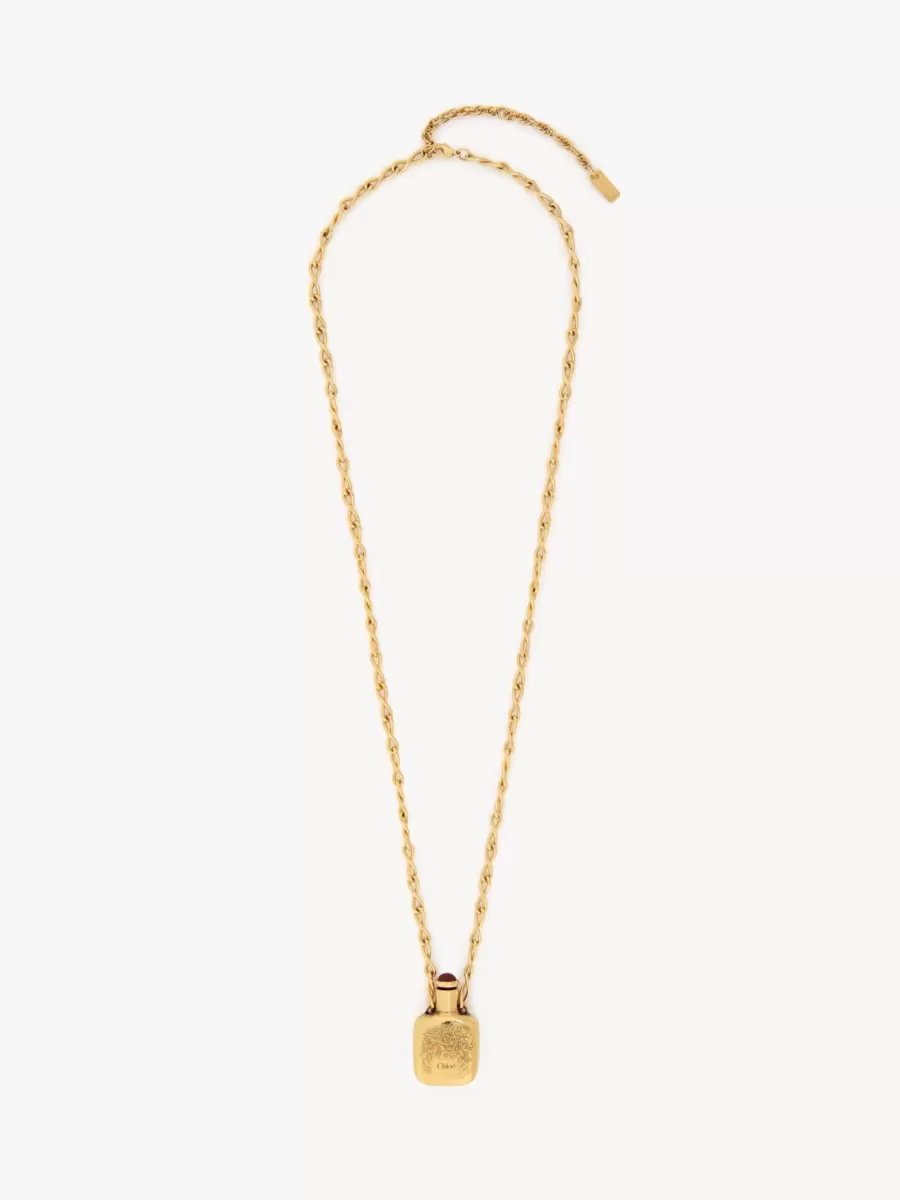 Chloé Elixir-hänge i vintagemässing med en dekorativ fyrkantig flaska infattad på en oändlighetskedja. En hartssten pryder locket. En Chloé-logotypgravyr signerar hänget, medan en guldfärgad Chloé-logotypplatta avslutar kedjan.