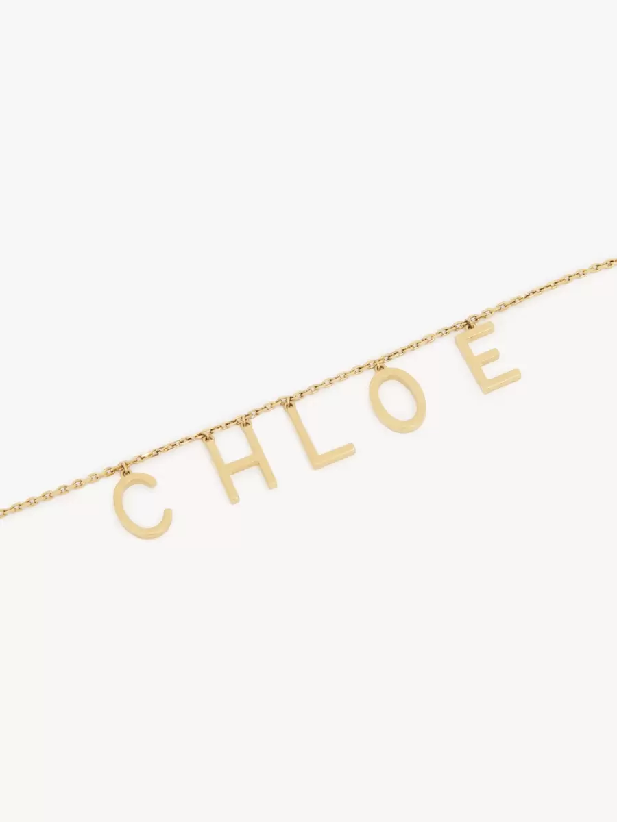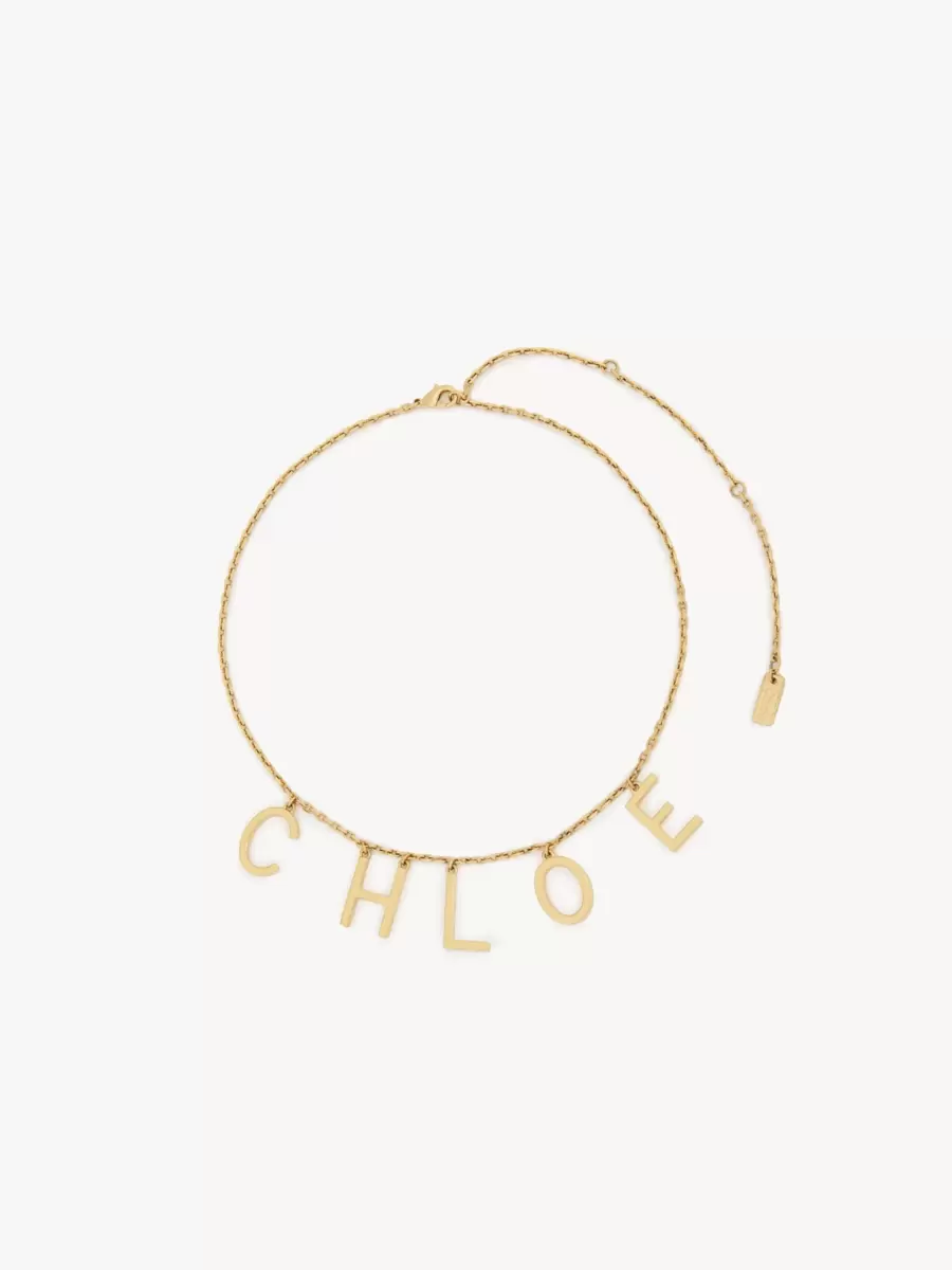 Chloé Letters-halsband i vintage guldmässing, som uttrycker Chloés signatur genom bokstavsberlocker. Den justerbara kedjan är signerad med en guldfärgad Chloé-logotypplatta.