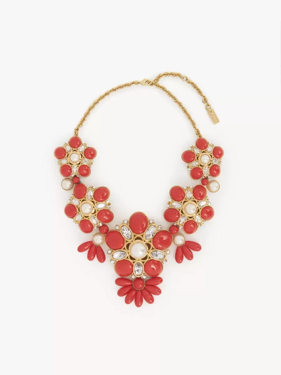 Chloé Magnifikt halsband i noggrant skuren vintage guldmässing. Dekorativa blommor i varierande storlekar hänger i en fin kedja, utsmyckad med infälld röd harts, hartspärlor och kristallglas. En guldfärgad Chloé-logotypskylt kännetecknar detta smycke.