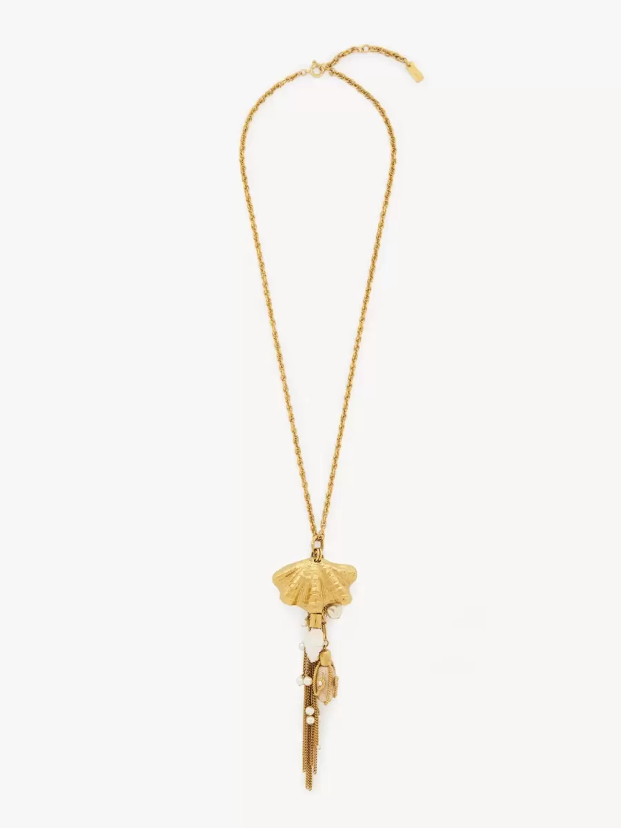 Chloé Shells-hänge i vintage guldmässing med en mängd olika texturer, inklusive riktiga snäckor. Den långa, justerbara kedjan är utsmyckad med ett stort snäckshänge och två mindre snäckor, dinglande kedjor och syntetiska pärlor. En Chloé-logotypplatta fulländar smycket.