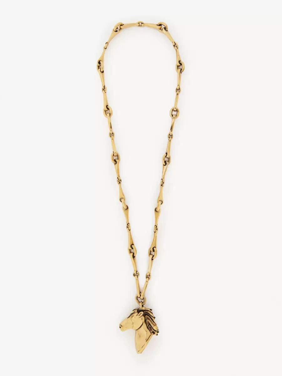 Halsband med hästhänge i vintage guldmässing som presenterades på höst-vinter 2024 års catwalk. Inspirerat av Maisons arkiv och kopplat till lädervarukollektionen är 3D-hästhänget fäst vid en kraftig kedja.