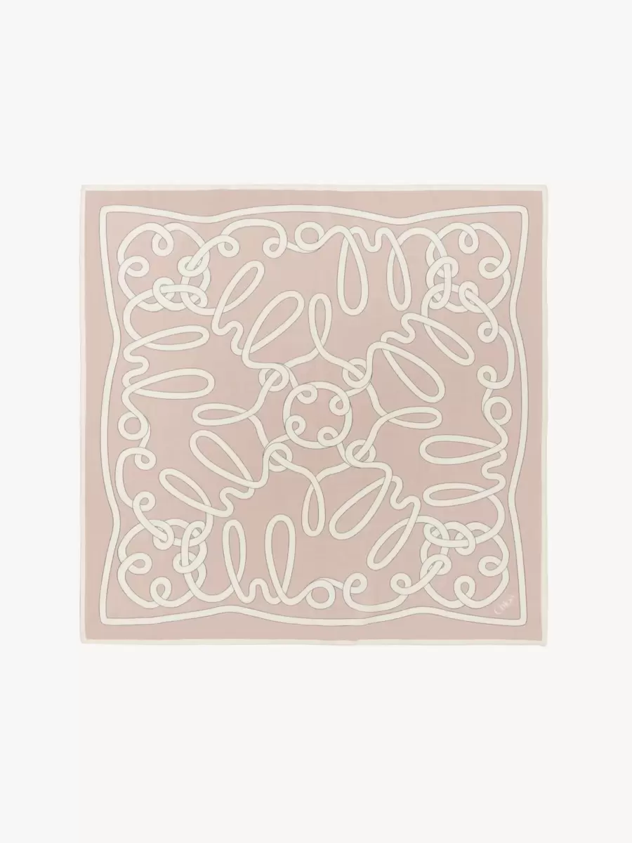 Chloé Iconic Print-halsduk i en blandning av ekologisk bomull och ekologiskt siden med bläckstråletryck, skuren i en bandanastorlek som är lätt att styla på huvudet eller halsen. Inspirerad av Maisons arv visas sammanvävda Chloé-logotyper i ett mjukt, handskrivet typsnitt, medan de lätta materialen spelar på transparens. Ett klassiskt Chloé-logotyptryck präglar hörnet.