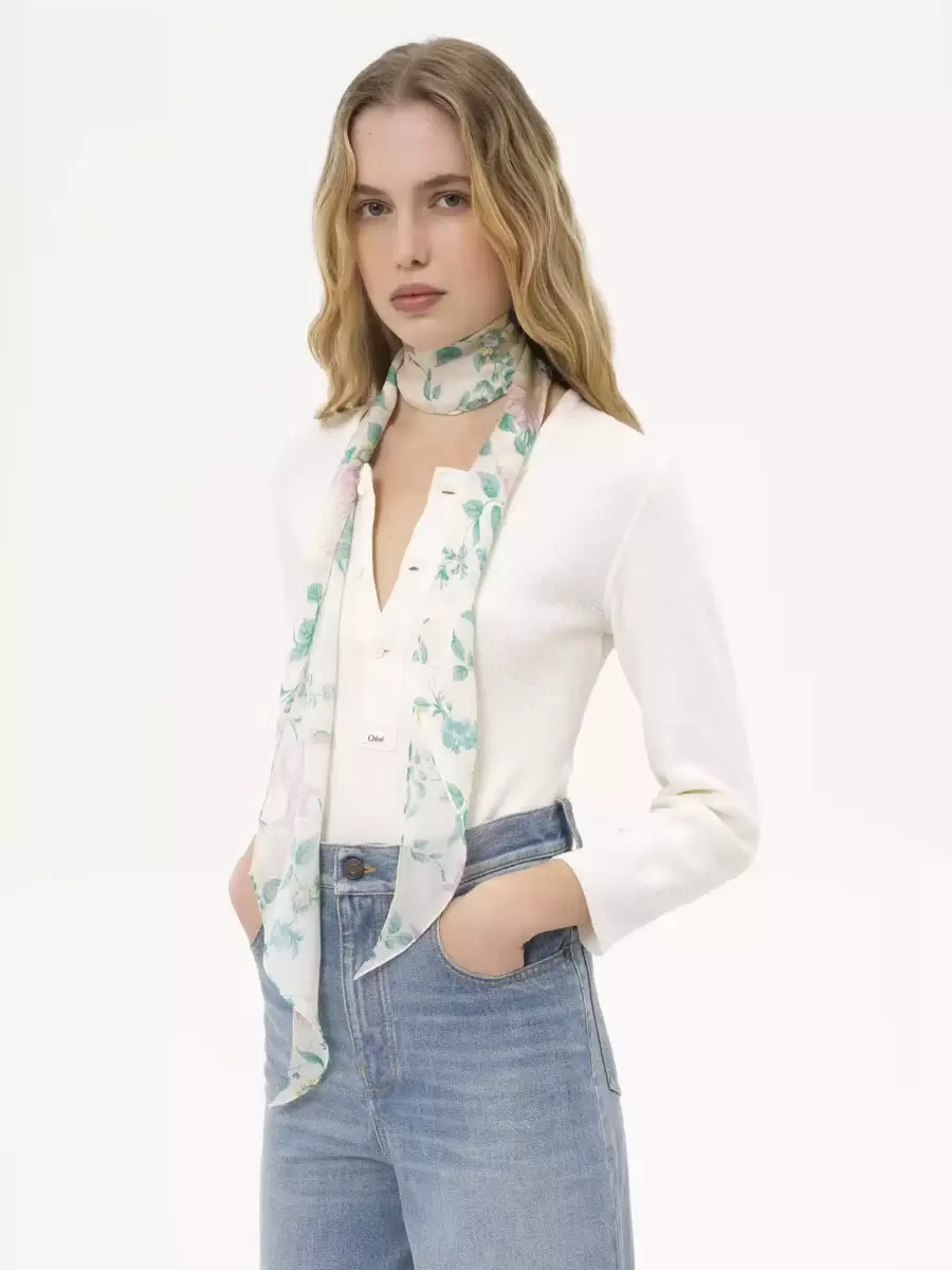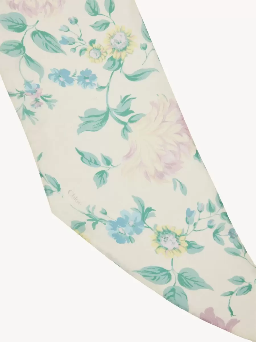 Mönstrad bandeau-halsduk i ekologisk sidencharmeuse med ett blommotiv som avbildar pioner och löv, inspirerad av Maisons arv. Den tunna, bläckstråletryckta halsduken är signerad med en subtil Chloé-logotyp i spetsen.