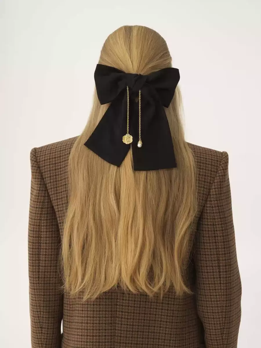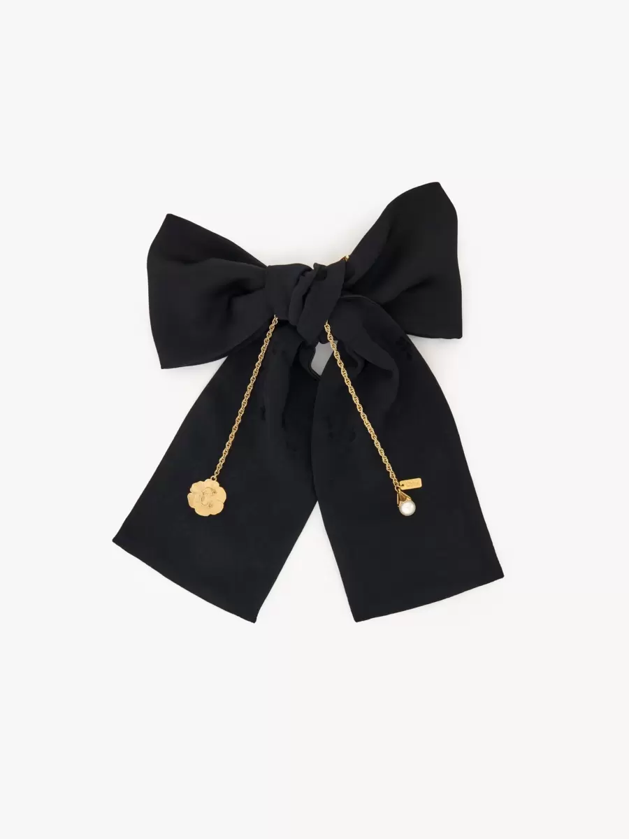 Chloé Candid stort hårspänne med rosett i en blandning av viskos och acetat, med en guldfärgad C-medalj i mässing och en pärlberlock, båda fästa på en dinglande kedja. En guldfärgad Chloé-logotypskylt pryder detta smycke.