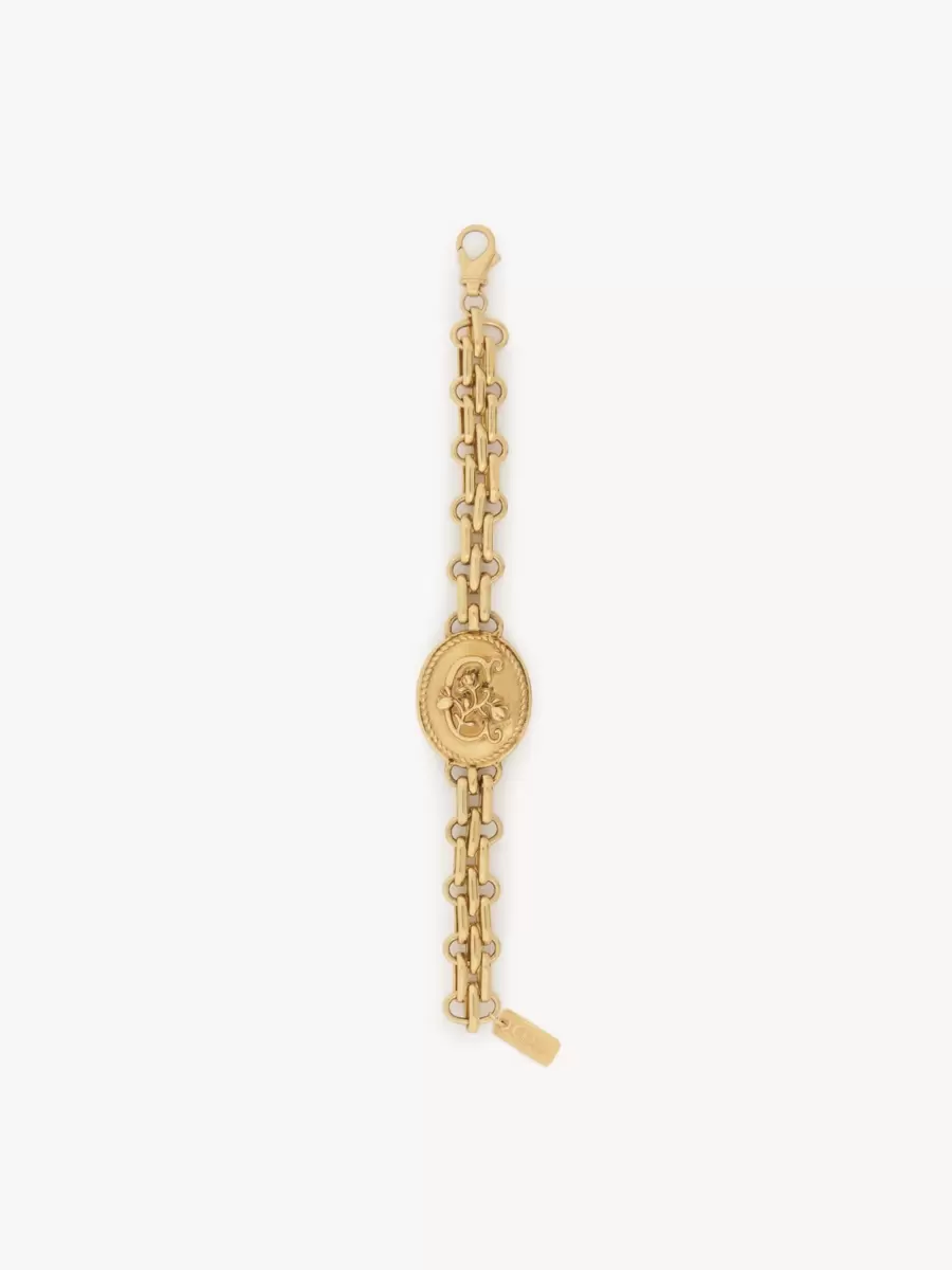 Château Treasures tankarmband i vintage guldmässing, utsmyckat med en dubbelsidig, blommig ”C”-medalj i mitten. En guldfärgad Chloé-logotypskylt signerar detta smycke.