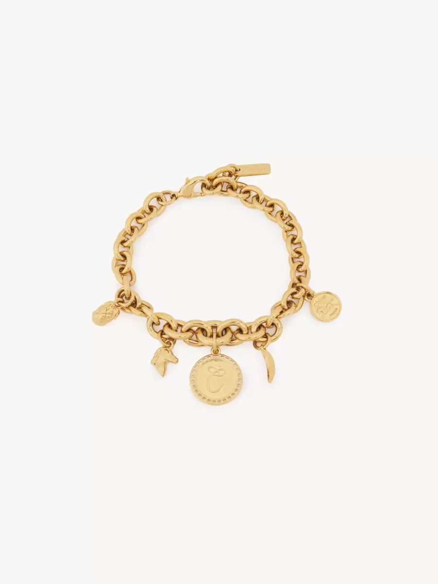Chloé Charms-armband i vintage guldmässing med flera berlocker rotade i Maisons DNA – från ananas till hästar, tillsammans med en ”C”-medalj konturerad med en spetsliknande kant. En Chloé-logotypetikett fulländar detta smycke.